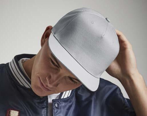 Panel frontal y visera: 100% algodón. Paneles traseros: 100% poliéster. 195 gr/m2. 5 paneles. Visera preformada. Ajustable por pestaña de plástico retro Snapback.