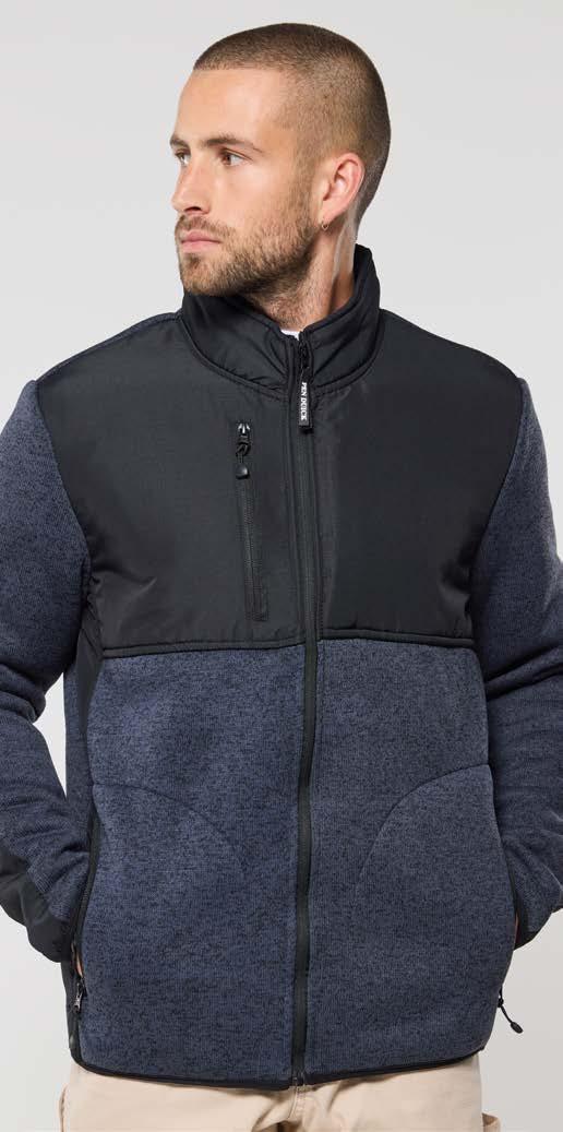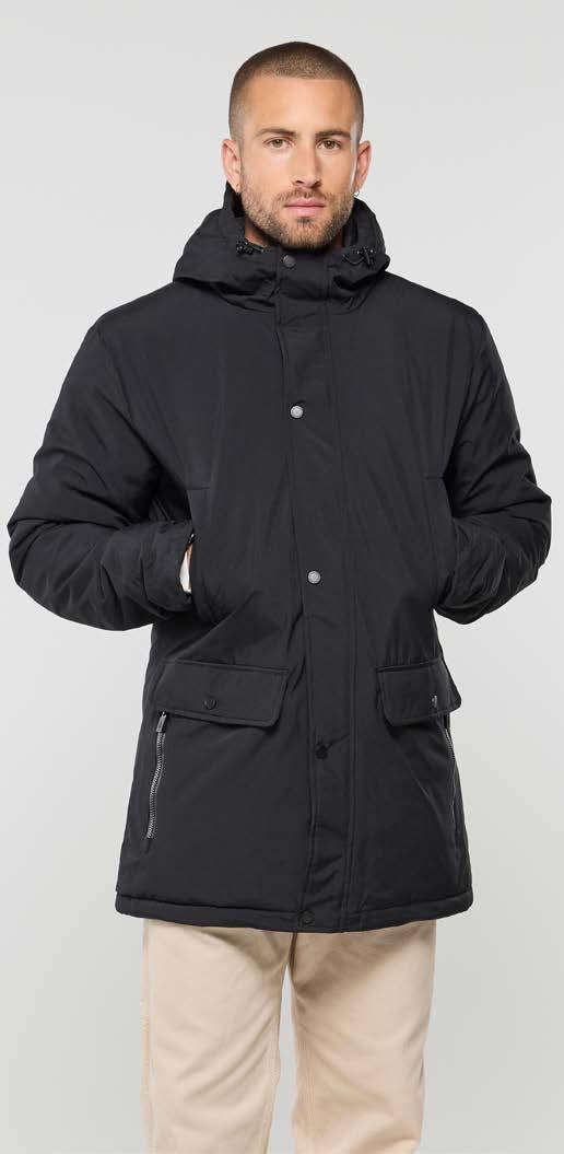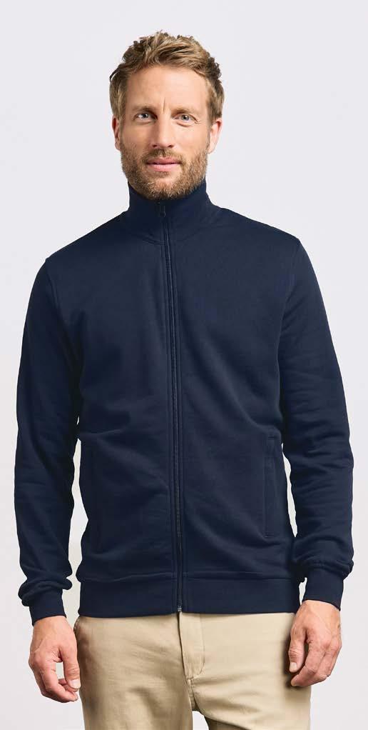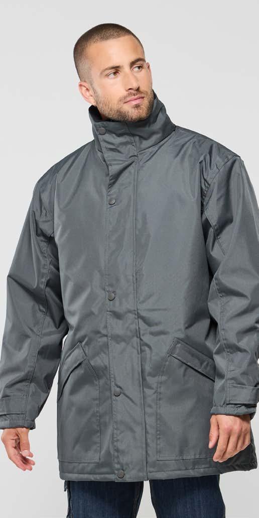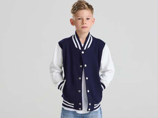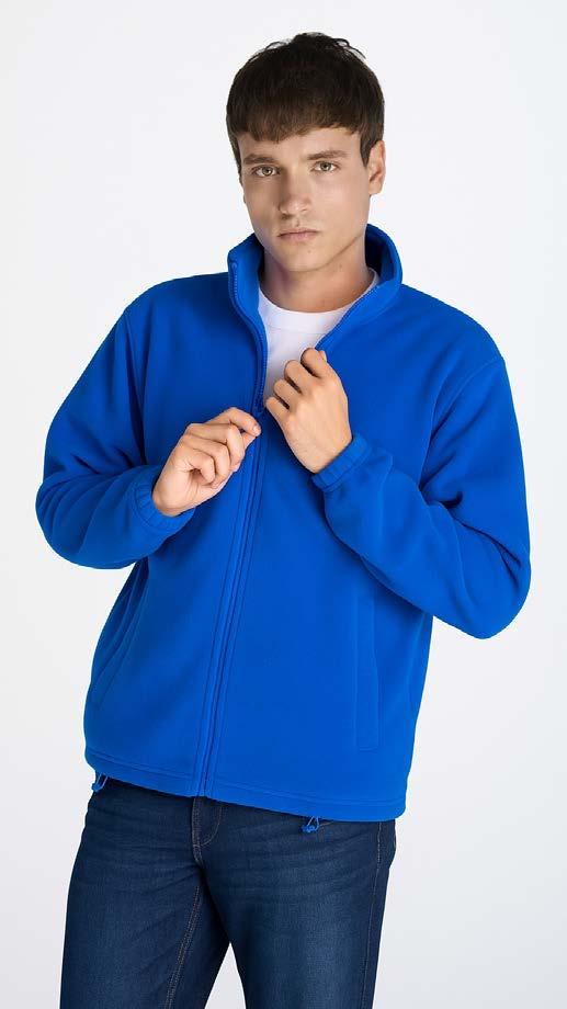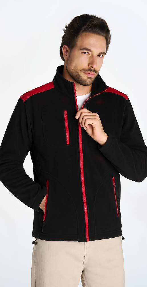 70% algodón Ringspun/30% poliéster. 330 gr/m2. Mangas contrastadas. Cuello, muñecas y cintura con tirilla elástica contrastada. Cierre por botones a presión. Interior perchado.