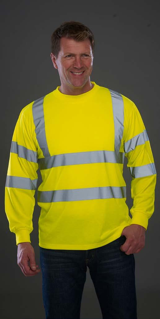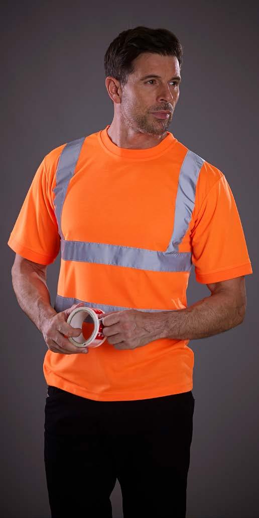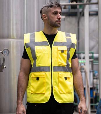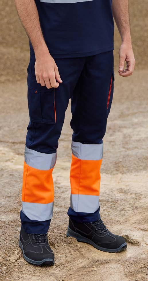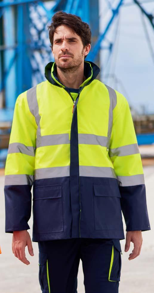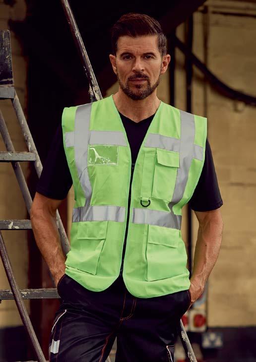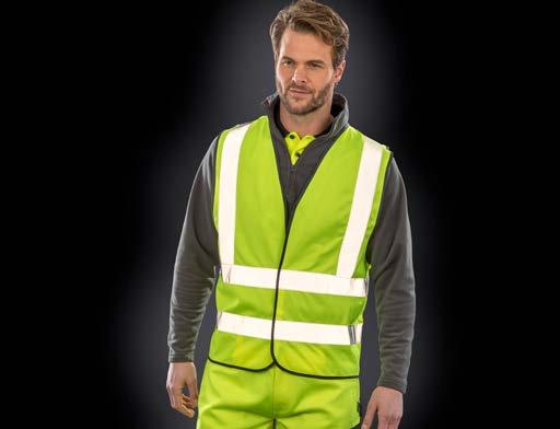 100% poliéster. 120 gr/m2. Tiras de seguridad de 50 mm cosidas. Cierre de Velcro®. Cumple la norma EN1150 y la Directiva Europea 89/686/CEE.