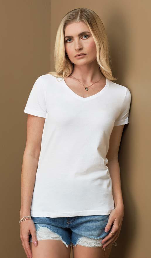 100% algodón Jersey. 165 gr/m2. Corte tubular. Cuello en V con ribete de algodón/Lycra®. Banda de refuerzo del mismo tejido en el reverso del cuello. Tejido y calibre más finos para una impresión de alta resolución.