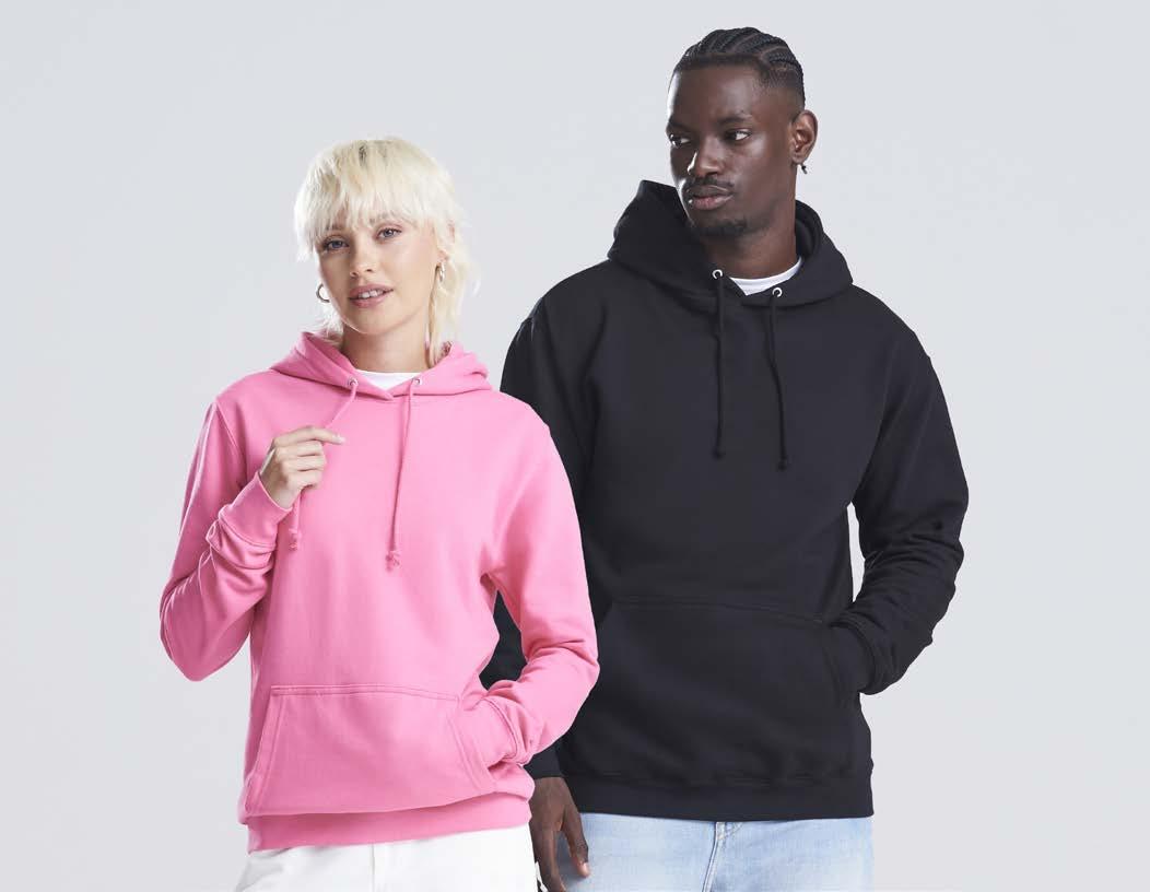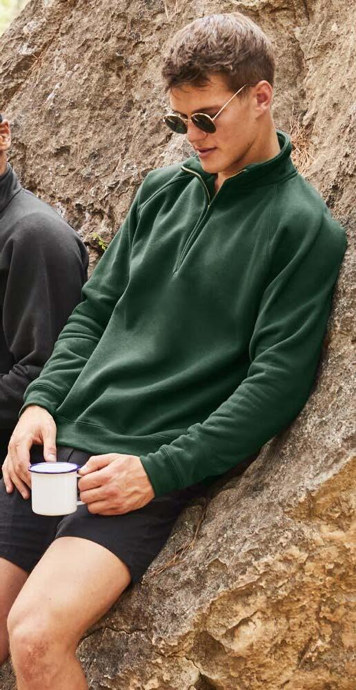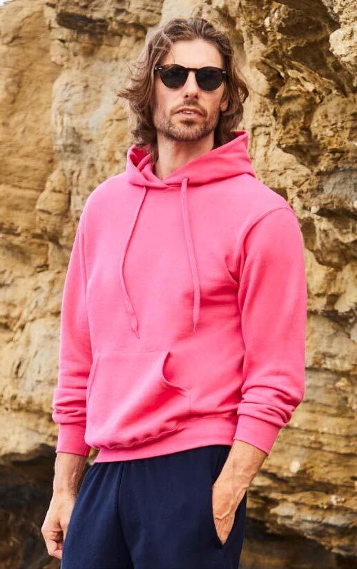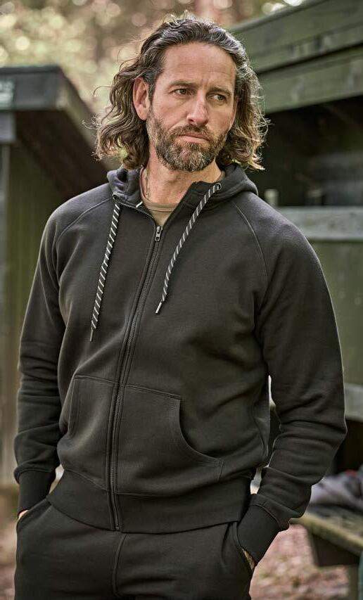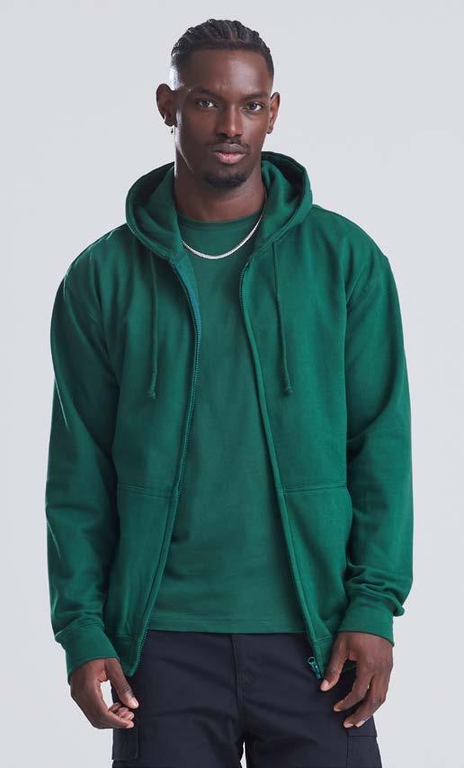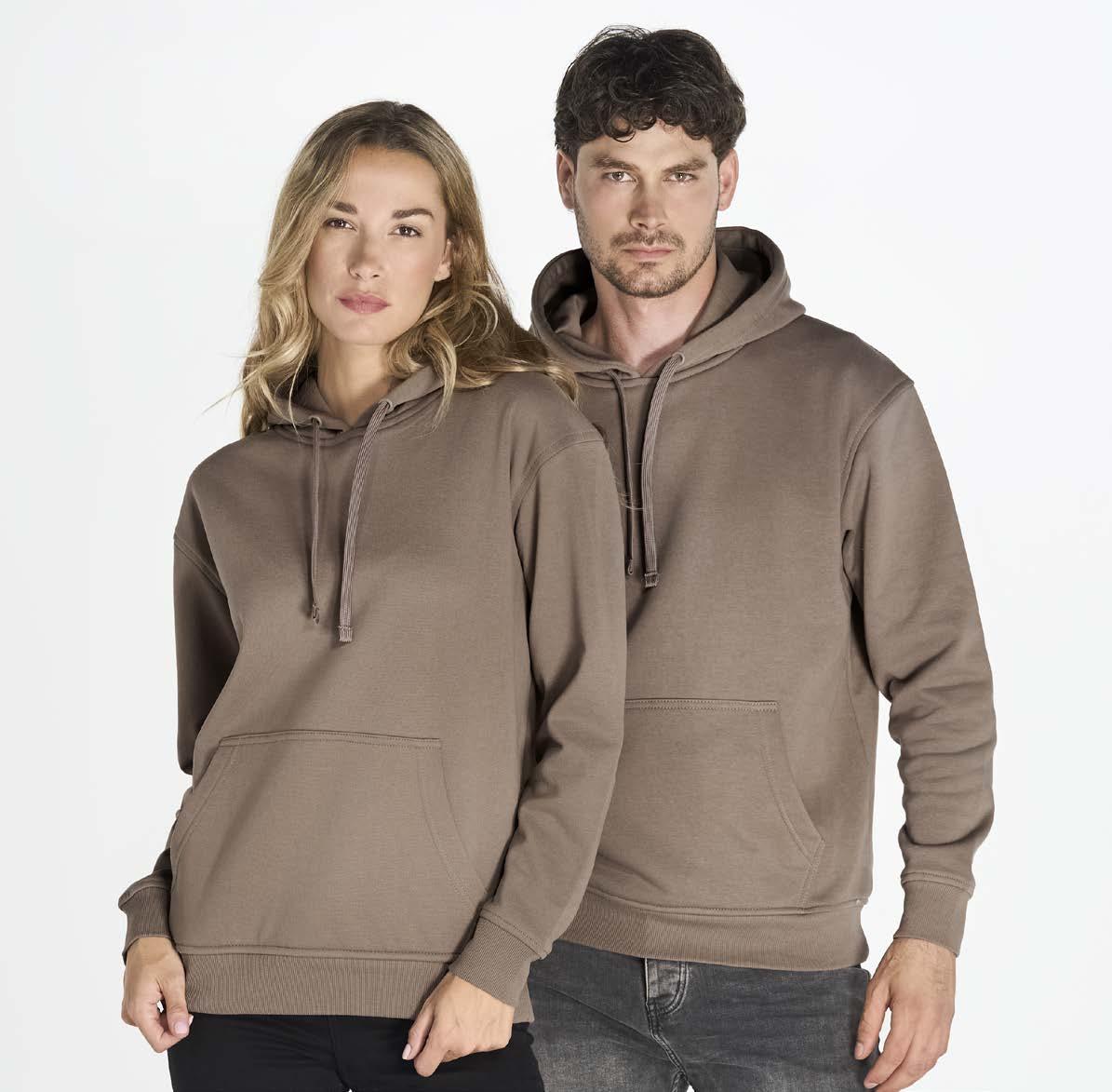 80% algodón Ringspun/20% poliéster. 280 gr/m2. Gran cremallera invisible. Capucha forrada. Bolsillo canguro. Interior perchado.
