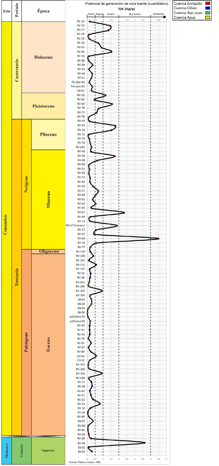 bueno y excelente en las Cuencas de San Juan (RV-67 con 2.332% de TOC) y Enriquillo (RV-09 con 4.499% de TOC y RV-17-Frontera con 1.884% de TOC), ver Figura 10 y Tabla 4.