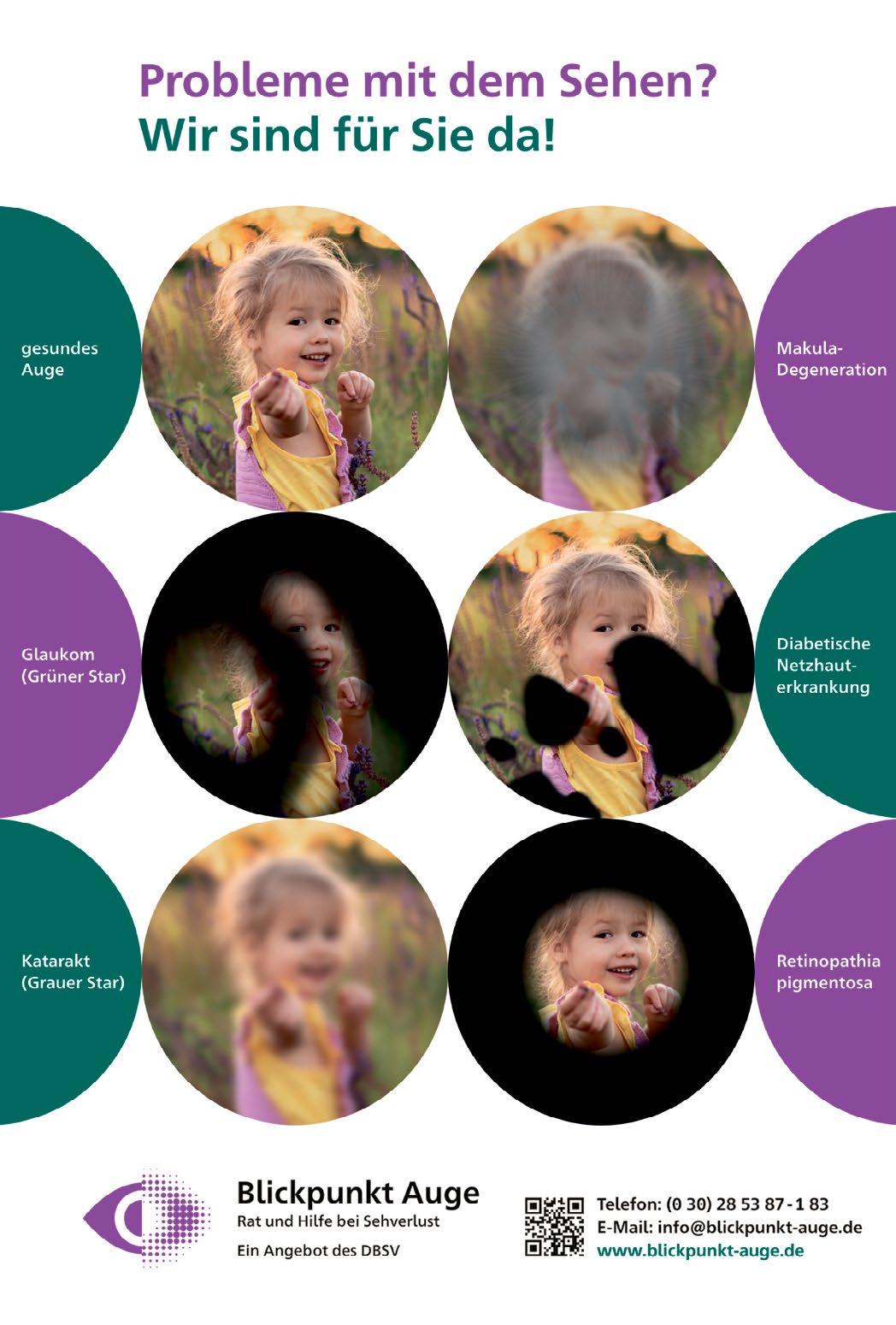 Die Blickpunkt-Auge-Beratung in Anspruch zu nehmen, kann am Anfang Überwindung kosten. Hier gibt es eine Fülle an Informationen zu Sehhilfen und anderen Hilfsmitteln, zu rechtlichen und finanziellen Fragen, zur Alltagsbewältigung, Mobilität und beruflichen Teilhabe. Bei Bedarf kann ein Austausch mit Gleichbetroffenen ermöglicht und an Fachberatungen vermittelt werden. Aber der regelmäßige Augenarztbesuch ist wichtig, um das vorhandene Sehvermögen so lange wie möglich zu erhalten. www.dbsv.org