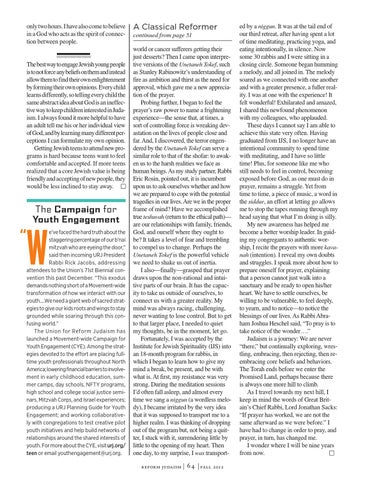 e’ve faced the hard truth about the staggering percentage of our b’nai mitzvah who are eyeing the door,” said then incoming URJ President Rabbi Rick Jacobs, addressing attendees to the Union’s 71st Biennial convention this past December. “This exodus demands nothing short of a Movement-wide transformation of how we interact with our youth….We need a giant web of sacred strategies to give our kids roots and wings to stay grounded while soaring through this confusing world.” The Union for Reform Judaism has launched a Movement-wide Campaign for Youth Engagement (CYE). Among the strategies devoted to the effort are placing fulltime youth professionals throughout North America; lowering financial barriers to involvement in early childhood education, summer camps, day schools, NFTY programs, high school and college social justice seminars, Mitzvah Corps, and Israel experiences; producing a URJ Planning Guide for Youth Engagement; and working collaboratively with congregations to test creative pilot youth initiatives and help build networks of relationships around the shared interests of youth. For more about the CYE, visit urj.org/ teen or email youthengagement@urj.org.