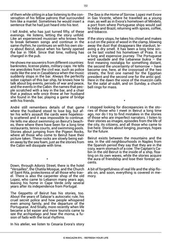 Down, through Adonis Street, there is the hotel “Versailles”, the Chatila Mosque, and the Church A bit of forgetfulness of real life and the ship floof Saint Rita, protectoress of all those who trav- ats on, and soon, everything is covered in meel. There is also the carpenter shop of the old mory. Lopez, who came to Lebanon many years ago, leaving his home in Cape Verde only several years after its independence from Portugal. The Geppetto of Beirut has his stories, too. About the years of Salazar’s autocratic rule, his cruel secret police and how people whispered even among family, and the departure of the Portuguese. And finally, more recently when life became a bit easier and more tourists came to see the archipelago and hear the morna, a fusion of fado with the local rhythms. In his atelier, we listen to Cesaria Evora’s story