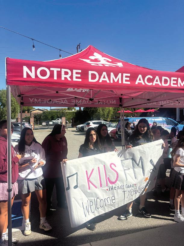On Wednesday, October 29, Notre Dame Academy students filed into their respective classrooms, ready for another day of enriching, impactful learning. The girls studied, took tests, and wrote notes with teachers guiding classes until lunchtime. Once the bell rang, the students leaped out of the high school building, eager to be with friends. Stepping outside, students were surprised to see a makeshift DJ booth with KIIS FM logo inscribed along the black table and music blaring out of the speakers, the beat palpable. As the music intensified and girls wondered what could be going on, Oliver Fox, the up-and-coming pop singer, stepped out to sing his new single, “Lucky To Lose Ü.” It wasn’t very long before students from middle school through high school crowded around, singing along to Fox’s original pieces and covers of pop songs. After Mr. Fox’s electrifying performance, Nathan Davis Jr., best known on TikTok as the “Yeah, yeah” guy, took the reins. Davis sang his hit single, “Woke Up This Morning,” before leading the student body in a short dance. He also gave a brief speech about allowing challenging times to bring yourself closer to God, tying it to his personal experiences while battling depression. After the singing and dancing came to a close, KIIS FM handed out swag, and each singer posed for pictures. Overall, the concert-like experience offered a lively break and brought the Notre Dame Academy community together, creating a memory students will not forget.