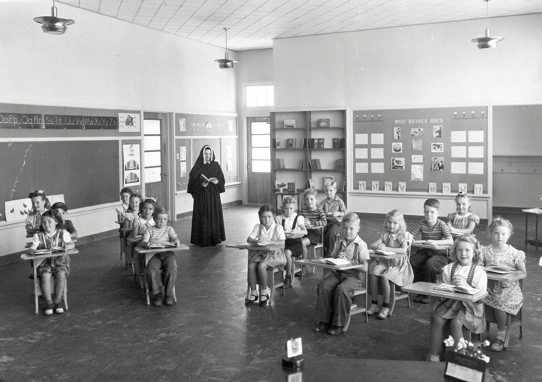 1948 With an incomplete annex for the first eighth graders in September, the Sisters rearrange the elementary classrooms to accommodate the middle school students for the month. Construction finishes by October 4, just in time to welcome the school’s first class of kindergartners along with the junior high students.