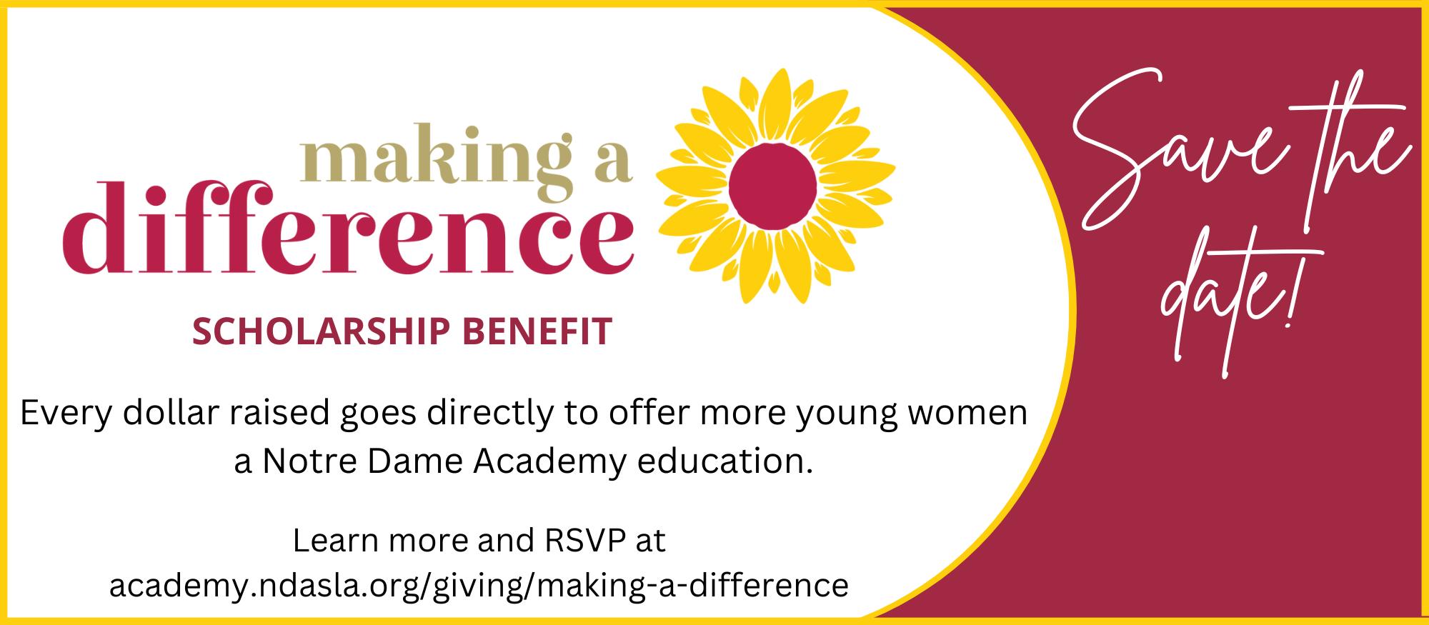 Join Notre Dame Academy for the fifth annual Making a Difference Scholarship Benefit on May 18, 2024.