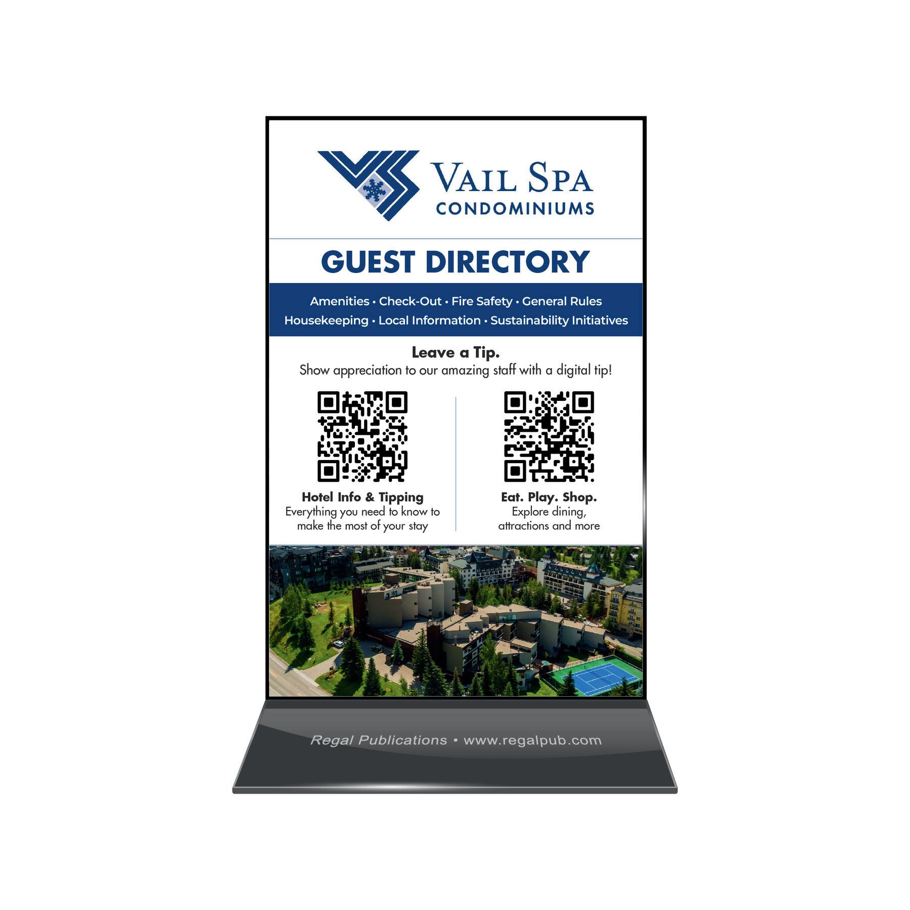 Regal custom digital directory is accessible by QR code and is presented on tabletop displays (see below) in every room. Scan of the QR codes below to see the user experience.