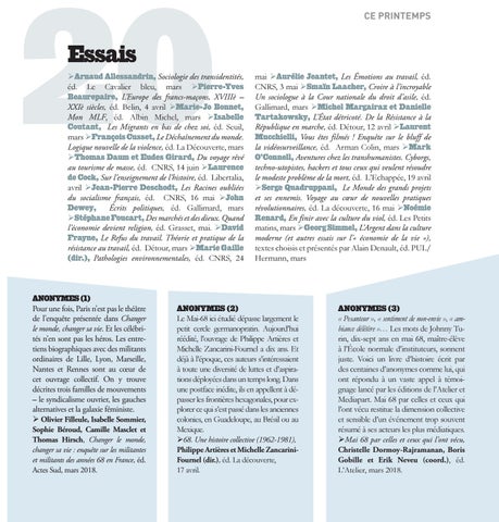 Arnaud Allessandrin, Sociologie des transidentités, éd. Le Cavalier bleu, mars Pierre-Yves Beaurepaire, L’Europe des francs-maçons, XVIIIè – XXIè siècles, éd. Belin, 4 avril Marie-Jo Bonnet, Mon MLF, éd. Albin Michel, mars Isabelle Coutant, Les Migrants en bas de chez soi, éd. Seuil, mars François Cusset, Le Déchaînement du monde. Logique nouvelle de la violence, éd. La Découverte, mars Thomas Daum et Eudes Girard, Du voyage rêvé au tourisme de masse, éd. CNRS, 14 juin Laurence de Cock, Sur l’enseignement de l’histoire, éd. Libertalia, avril Jean-Pierre Deschodt, Les Racines oubliées du socialisme français, éd. CNRS, 16 mai John Dewey, Écrits politiques, éd. Gallimard, mars Stéphane Foucart, Des marchés et des dieux. Quand l’économie devient religion, éd. Grasset, mai. David Frayne, Le Refus du travail. Théorie et pratique de la résistance au travail, éd. Détour, mars Marie Gaille (dir.), Pathologies environnementales, éd. CNRS, 24