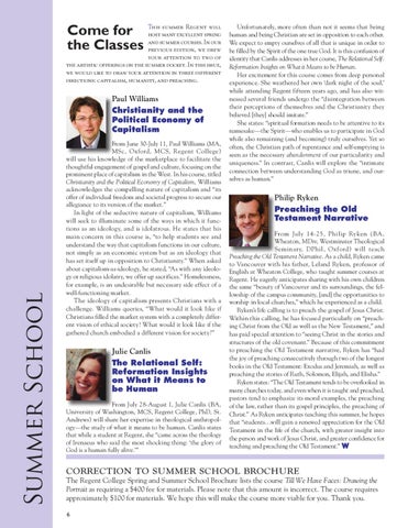 summer Regent will Come for This host many excellent spring summer courses. In our the Classes and previous edition, we drew your attention to two of the artistic offerings on the summer docket. In this issue, we would like to draw your attention in three different directions: capitalism, humanity, and preaching.