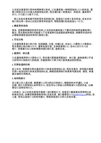 首先,您需要明确您的写作目的。论文的目的通常是为了展示您的研究成果和学术 能力,而文章的目的则可能是为了分享某种观点或提供某种信息。明确写作目的可 以帮助您确定适合的写作风格和语言。
