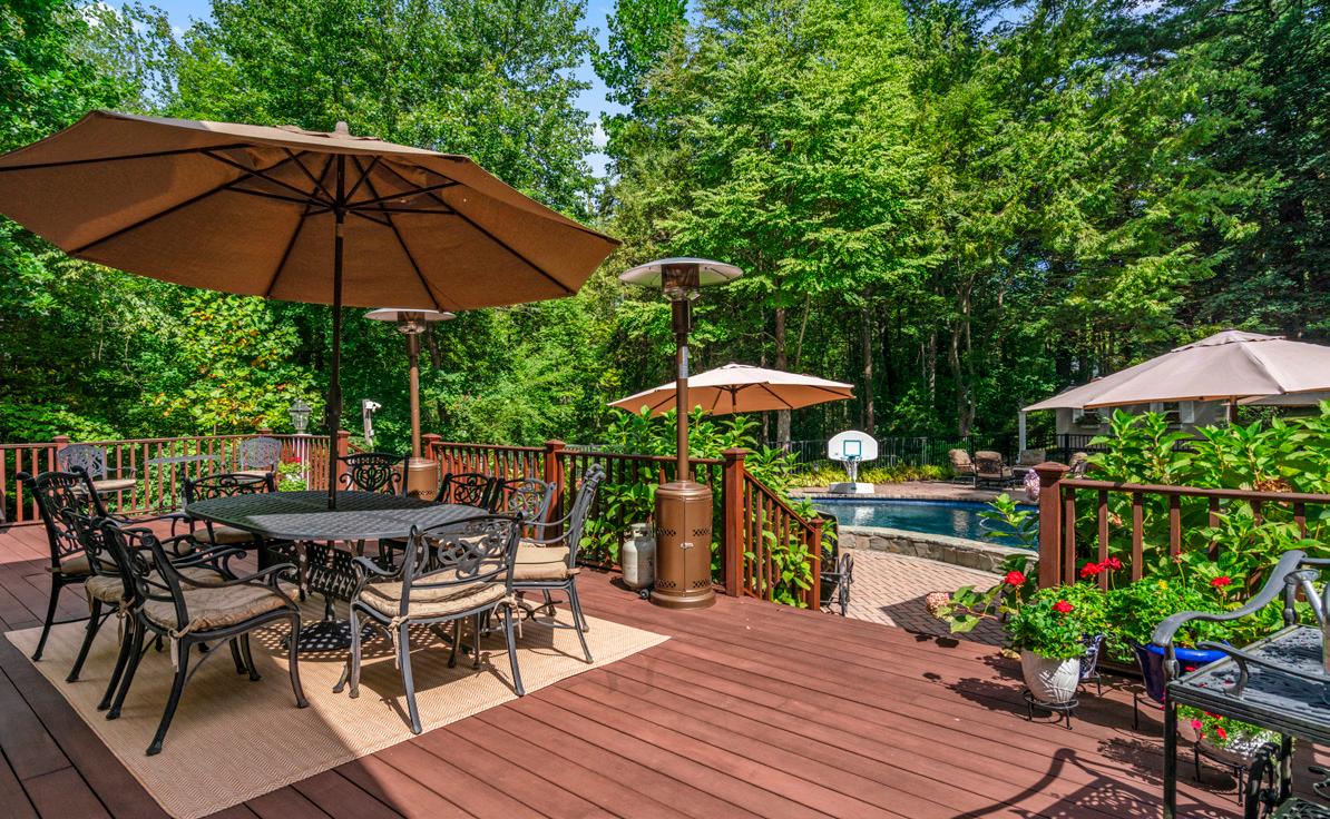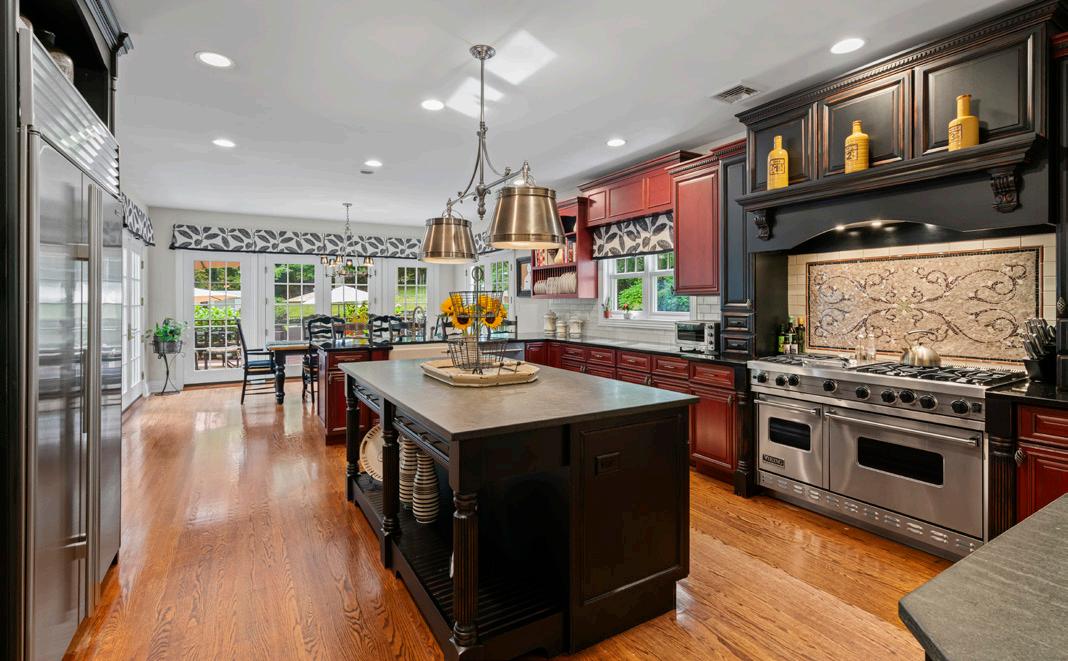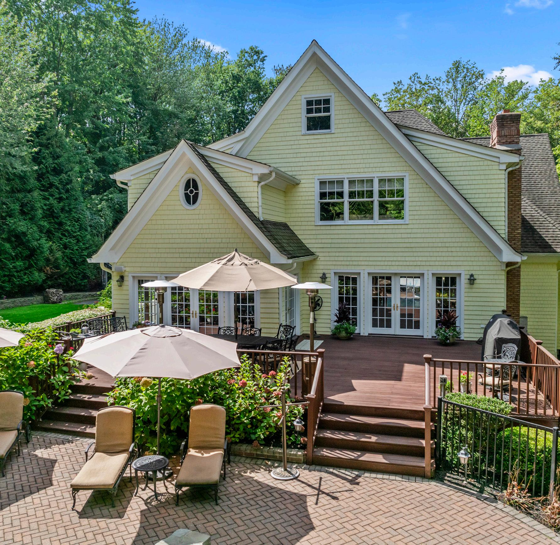 The chef’s kitchen is a masterpiece, with stainless steel appliances, a six-burner Viking grill cooktop range with double ovens below, and a commercial-grade hood. Granite countertops, a sandstone island, large walk-in pantry, and extensive two-tone cabinetry elevate the space. Three sets of French doors lead to a large mahogany deck, great for outdoor dining and relaxation. The great room off the kitchen is equally impressive, featuring a wood-burning fireplace with access to the deck through French doors, creating a seamless indoor-outdoor flow.