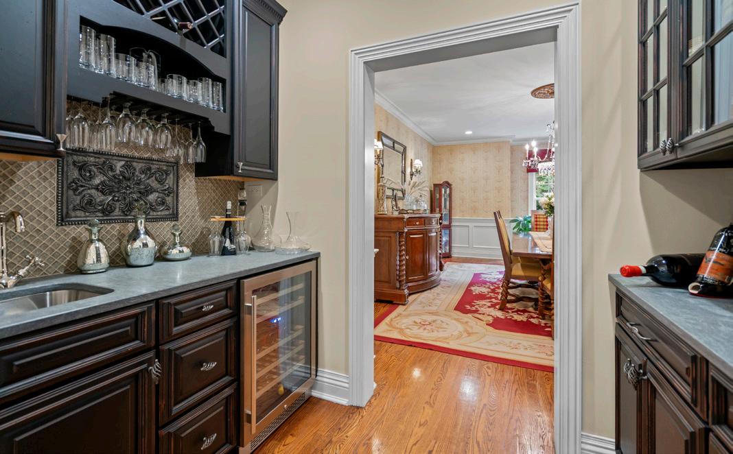 Rich solid oak floors run throughout, complemented by detailed custom millwork and a stunning billiards room with a coffered ceiling, built-in speakers, custom leather wall coverings, a built-in window bench with storage, adding both beauty and function. The butler’s pantry comes complete with a Frankie sink and custom dark wood cabinetry—ideal for entertaining which adjoins the formal dining room.