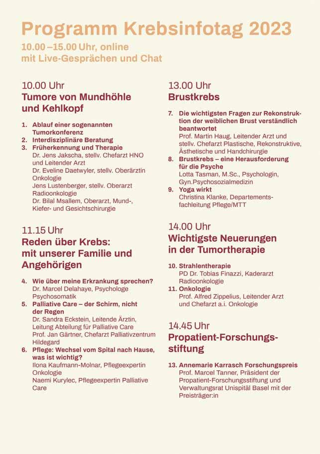 Den Krebsinfotag führen wir online durch unter unispital-basel.ch/tumorzentrum. Sie können das Geschehen von zuhause aus mitverfolgen und im Chat aktiv teilnehmen. Über Ihr Interesse freuen wir uns!