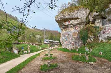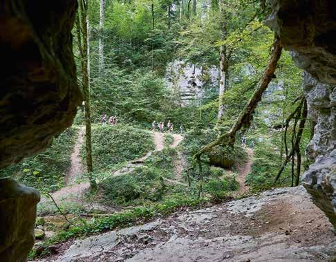 Ganze Schulklassen erkunden auf ihren Ausflügen das Chaltbrunnental mit seinem Karstlehrpfad, seinen Quellen, seinen 70 Moosarten und den schleichenden Feuersalamandern. Ein einzigartiges Naturreich. Nach dem Pfad von Grellingen entlang der Birs und der Jurabahn, die demnächst zweispurig die von Gustave Eiffel entworfenen Eisenbahnbrücken überquert, laden Picknickplätze am Chessiloch zur ersten Rast. Ein patriotischer Ort mit den im 1. und 2. Weltkrieg von Grenztruppen bemalten Wappenfelsen. Wild durcheinander haben die Soldaten die Wappen der Heimat, das weisse Kreuz im roten Feld, und ihre Kantone Aargau, Bern, Luzern, Solothurn, Tessin, auch das Kloster St. Gallen mit dem züngelnden Bären bis zur Studentenverbindung Zofingia verewigt. Ein Wappenmeer an den teils überhängenden Felsen.