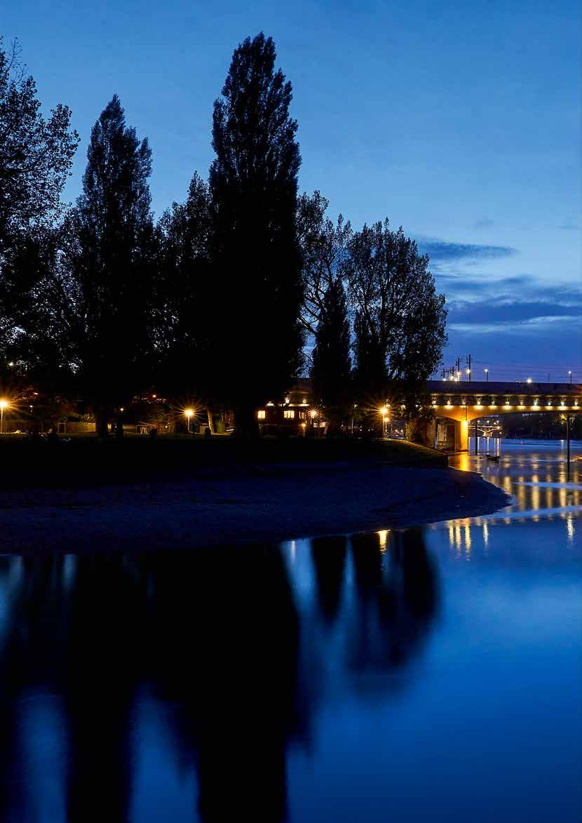 Impressionen im Licht der Dämmerung am Birsköpfli mit der Eisenbahnbrücke, die den Schweizer mit dem Badischen Bahnhof verbindet, und den beiden 178 resp. 205 Meter hohen Roche-Türmen als Basels neuer Skyline.