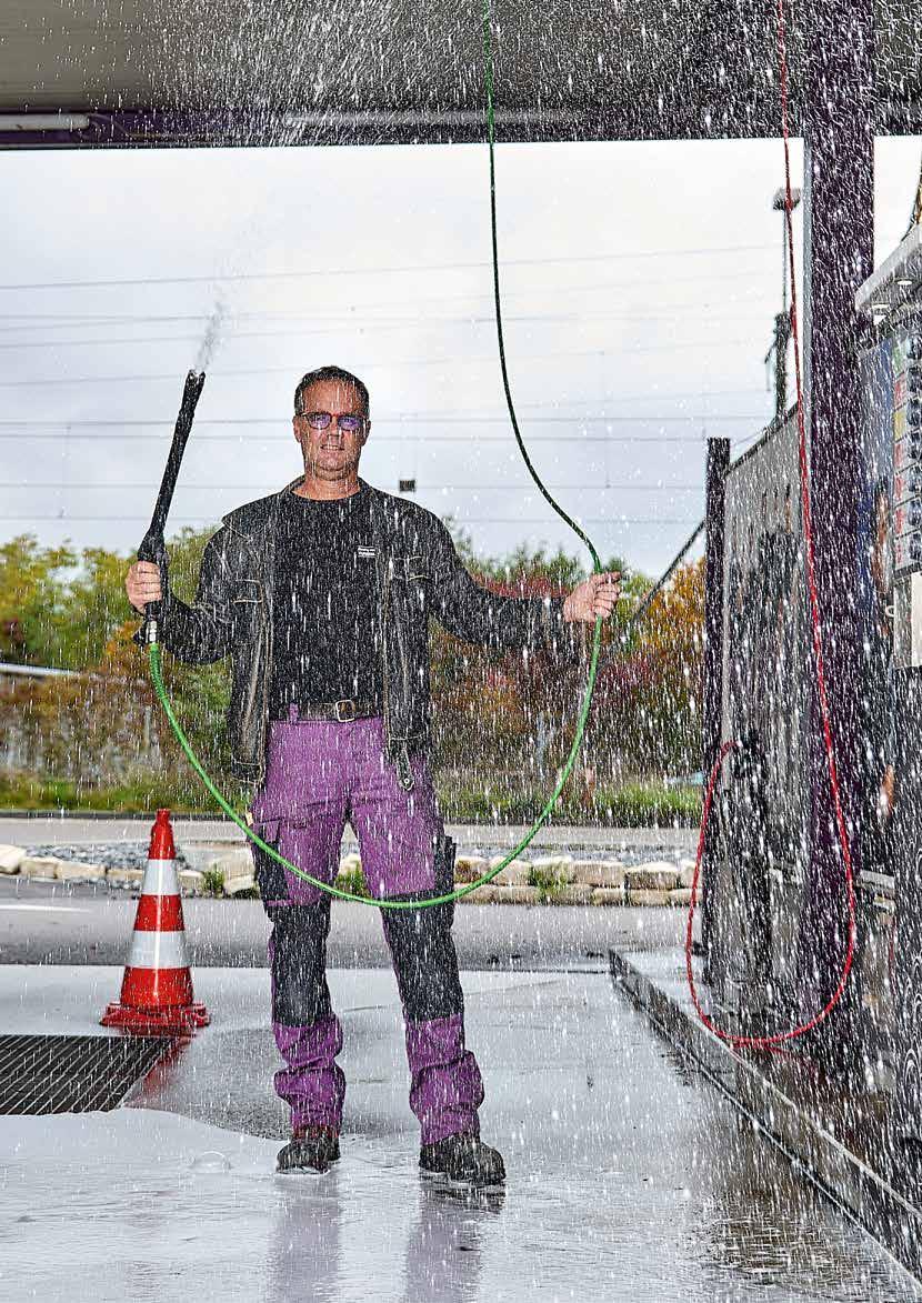 Viele bleiben länger oder lang. So eine Autowäsche braucht nämlich Zeit. Das Programm besteht aus Vorwäsche mit Schlauch und Hochdruckreinigung mit Spritzpistole samt schneeweissem Schaum, mit Bürsten gefegten Felgen, Klarspülung mit Kessel, Lackpolitur, Hochglanzappretur sowie partikelfreiem Staubsaugen und kann in nicht wenigen Fällen bis zu einer Stunde dauern. Manchmal braucht es zur Finissage noch ein ergänzendes Produkt aus dem Shopgestell, das einem Beauty angebot in einer Parfümerie ähnelt: Spray, Crème, Watte, Öltinktur. Oder die Carrosse rie muss noch rundum mit einem Frottée tuch abgefächelt werden, damit sie keine Kratzer abkriegt. So hopp geht das alles nicht, wenn das Auto am Ende nicht nur gewaschen, sondern auch blitzsauber sein
