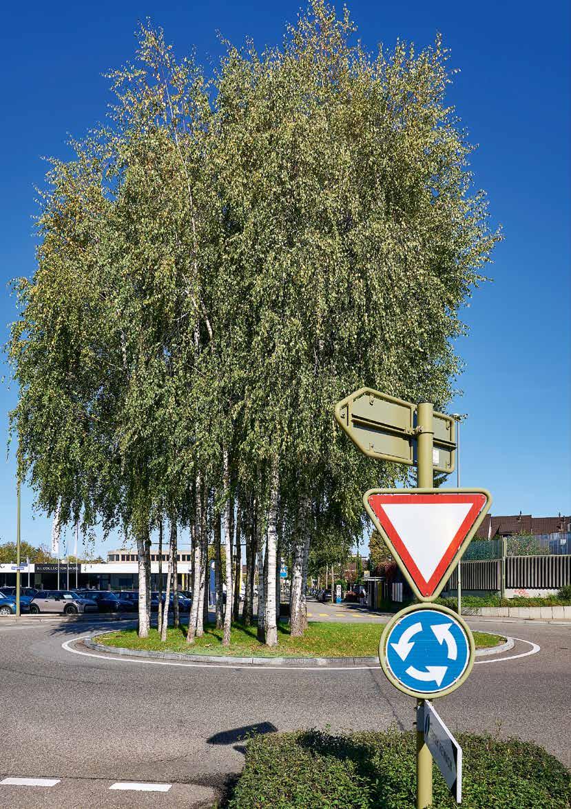 Die Idee, das Auge des Kreisels mit mög lichst lokaler Kunst zu bespielen, ist gang und gäbe. Ebenso beliebt ist eine Bepflan zung, so dass inmitten von Beton und krei senden Motoren eine grüne Oase entsteht nach dem Motto: Biodiversität statt Stein wüste. Ein schönes Beispiel hierfür findet sich etwas weiter südlich von Aesch auf Reinacher Boden, wo die Neuhofstrasse von der Hauptstrasse ins Wirtschaftsge