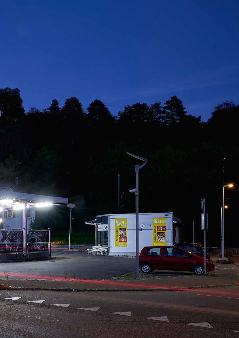 c/o CAR WASH gibt es (fast) nichts, was es nicht gibt und treffen sich zwischen Son nenauf- und Sonnenuntergang sprich wörtlich Gott und die Welt. Der Schauplatz besteht aus vier ferngesteuerten, neon beleuchteten High-Tech-Outdoor-WaschBoxen mit Geldautomat und zwei monströ sen Staubsaugern, jeder Menge Parkplätze sowie einer Holzofenbäckerei mit Bistro, Take away, inklusive mächtigem Holztisch und -bank zum Verweilen. Das Angebot der Bäckerei «Brot & So» darf sich sehen lassen: Rustikale Brote, Sandwiches, Brötli, Gipfeli und Weggen aller Art, dazu Salate und Snacks, je nach Wunsch warm oder kalt. Und erst die Patisserie sieht, schick präsentiert, wie vom Feinsten aus. Wem das noch nicht genug ist, der kann zwi schen zahlreichen hausgemachten und von Hand beschrifteten Konfitüregläsern aus wählen oder sich mit den süssesten Scho koschüümli und Sunnereedli eindecken. Und wenn nötig, gibt es auch Zigaretten aus der Schublade. Schlaraffenländliche