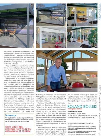 Oben links: Glashaus als Witterungsschutz im Garten Unten links: Immer Willkommen in der Ausstellung Oben mitte: Quadratische Pergola, mal geöffnet, mal geschlossen Oben rechts: Grosszügige Ausstellungsräume der Firma Roland Boller GmbH in Binzen Unten rechts: Geschäftsführer Thomas Schleider