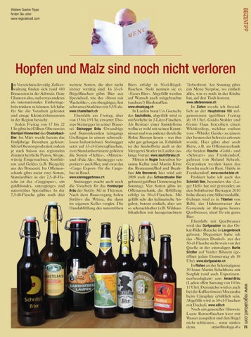 genommen (geöffnet Freitag ab 18 Uhr). Guido Stohler und Genio Haas betreiben einen Whiskyshop, welcher soeben vom «Whisky Guide» zu einem der besten der Schweiz erkoren wurde. Hier gibts aber auch Biere, z.B. im Offenausschank die beiden Roscha «Gold» und «Schwarz» aus Frenkendorf, gebraut von Roland Schaub. Getrunken werden kann das Roscha auch im Rest. Halde in Frenkendorf. www.roscha-bier.ch Probiert habe ich auch das Schnitzli Bier, besonders das «Lager Hell» hat mir gemundet; an den Solothurner Biertagen 2010 holte dieses eine Silbermedaille. Gebraut wird es in Titterten von Röbi, das Hahnenwasser der Gemeinde ist übrigens bestes Quellwasser, ideal für ein gutes Bier. Ebenfalls mit Quellwasser wird das Dorfgassbier in der Oskar-Bider-Baracke in Langenbruck gebraut. Degustiert habe ich das «Weizen Dunkel» aus der 50-cl-Flasche nicht weit von der Quelle in der einmaligen Burlis SiloBar auf Vorder Bilstein (geöffnet jeden Donnerstag ab 18 Uhr). www.dorfgassbier.ch In Riehen an der Schmiedgasse 30 braut Martin Schultheiss mit Sorgfalt (und auch Experimentierfreudigkeit) sein Amsel-Bräu (Laden offen Samstag von 10 bis 17 Uhr). Demnächst wird es auch bei der Kaffeerösterei Moccaraba beim Claraplatz erhältlich sein. Abgefüllt wird in 50-cl-Flaschen mit Deckeli. www.s30.ch Noch ein genereller Hinweis: Leere Retourflaschen kurz mit Wasser ausspülen und den Bügel nicht schliessen... sonst stinkts denn. stefan@tschopp.ch I 75