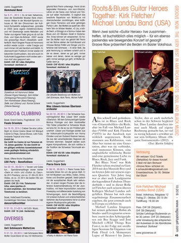 Kirk Fletcher / Michael Landau Band (USA) Basel, Volkshaus, Rebgasse 12 Freitag 21. Oktober, 20.15 Uhr Türöffnung: 19.30 Uhr Preis: CHF 59 (Sitzplatz), CHF 39 (Stehplatz) Schüler/Lehrlinge /Studierende unter 30 Jahren: CHF 20 (Stehplatz) unter Vorweisung des entsprechenden Ausweises an der Abendkasse. Vorverkauf: Starticket www.groovenow.ch