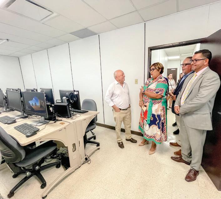 Desde el vestíbulo de la nueva Conexión Laboral, desde la izquierda; la alcaldesa de Patillas, Maritza Sánchez Neris, los alcalde de Las Piedras, Miguel “Mickey” López, de Juncos, Alfredo “Papo” Alejandro y de San Lorenzo, Jaime Alverio. Seguidos del Lcdo. Méndez Rosa presidente de la Junta Local, del director ejecutivo Leslie A. Hernández y de la senadora Rosamar Trujillo. En uno de los salones con computadoras durante el recorrido por el nuevo local.