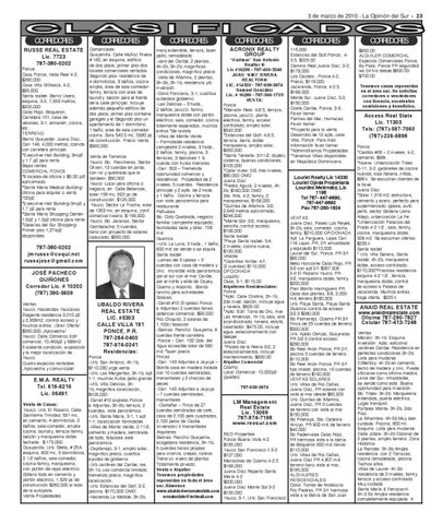 115,000 marq extendida, terraza, buen Estancias del Golf,Ponce, 4patio, remodelado “Marimar” San Antonio 3.5, $225,00 -Jard del Caribe, 2 plantas, Realtor ® Camino Real,Juana Diaz, 3-2, 4h-2b, 3h-2b, magníficas Lic #16299 - 787-403-5340 $178,000 condiciones, magnífico precio JUAN “KIKI” RIVERA Los Caobos , Ponce,4-2, -Valle de Altamira, 2 plantas, REALTOR® Precio, $119,000 3h-3b, 3h-1b, residencia y/o LIC. #14533 - 787-638-3874 Jacaranda, Ponce, 4-2.5, inversión Samuel González $169,000 -Cond Ponciana, 3-1, cualifica Lic. # 16286 - 787-366-1735 Monte Sur, Juana Díaz, 3-2, subsidios gobierno. VENTA: $150,000 -Las Delicias – 3 habs., Ponce: Costa Caribe, Ponce, 3-3, 2 baños, jacuzzi, family, *Mansión Real- 4/3.5, terraza, Favor llamar marquesina doble con portón piscina, jacuzzi, planta Palmas del Mar, Humacao, eléctrico, sala, comedor, cocina, eléctrica, family, acceso Favor llamar totalmente separados, muchos controlado, amplio solar, *Proyecto para la venta: $540,000 extras *de revista Desarrollo de 12 apts, calle *Estancias del Golf- 4/3.5, -Villas de Monte Verde Villa, Ponce. Para más terraza, barra, doble – Formidable residencia marquesina, amplio solar, información favor llamar. campestre 2 niveles, 3 habs., $260,000 *Administramos Propiedades 2 baños, family, piscina, 3 *Santa Teresita- 3/11/2, dúplex, *Tenemos Villas disponibles Venta de Terrenos: terrazas, 3 balcones 1 ½ cisterna, buenas condiciones, en República Dominicana. Yauco: Bo . Rancheras, Sector cuerda con frutas menores $105,000 Olivari, 13 cuerdas en jarda, -Carr. 503 – Tremenda *Calle Vives- 5/3, tres niveles, con río y quebrada que le oportunidad comercial y $80,000 OMO Louriel Realty Lic 14330 bordean, $50,000 residencial. Propiedad de 2 Juana Díaz: Louriel Ojeda Propietaria Yauco: Local para oficina o niveles, 5 cuerdas. Residencia *Piedra Aguzá, 2 niveles, 4hLourdes Meléndez, Lic negocio, en Calle Betances, principal y 2 apts. de 2 habs. 2b, $160,000 OMO 1198 solar 159 mc, 623 pc de y 1 baño. Cocina y terraza Sta. Rita, 4-2, family, 2 Tel 787- 447-9690, construcción, $125,000 marquesinas, $158,000 con vista panorámica para 787-447-9692 Yauco: Sector La Trocha, solar restaurante *Quintas de Altamira- 3/2, Fax 787-260-1824 de 1353 mc, en esquina, zonif. Peñuelas: 2,649 metros aproximado, comercial liviano, $ 158,000. $246,000 Bo. Coto Quebrada, negocio VENTAS *Monte Sol- 3/2, marquesina, Yauco: Bo. Jácanas, Sector familiar campestre equipado, Juana Díaz, Paseo Los Reyes, sencilla, control acceso, Cambalache, 5 cuerdas, facilidades baile y billar, 728 3h-2b, sala, comedor, cocina, $136,000 llano con proyecto de solares m/c family, $210,000 OPCIONADA Santa Isabel: caducado. $350,000. Apt. La Parguera, Lajas Carr. Guanica: *Playa Santa Isabel- 5/4, 116 Lajas, PR, 2/1 amueblado –Urb. La Luna, 3 habs., 1 baño, 2 niveles, cocina nueva, y equipado $110,000 600 m/c se vende o se alquila $130,000 Laurel del Sur, Ponce, PR 3/1 Santa Isabel: Villalba: $90,000 -Lomas del Expreso – 5 *Caonillas Arriba- 4/1, Bello Horizonte Cabo Rojo, PR cuerdas con casa de madera y (2 cuerdas) $110,000 3/2 con apt 2/1 $307,000 zinc. Increíble vista panorámica OPCIONADA Ext El Rosario Yauco, PR por el sur con el mar Caribe, Luquillo: 3/2, marquesina doble, family Casa, 3-1, $115,00 por el norte y este de Cayey, $200,000 Alquileres Residenciales: Coamo y Aibonito. Bonito Plan Bonito Hormiguero PR Ponce: rancho para actividades Casa dos plantas, 6/3, 2,000 *Apto. Calle Cristina, 2h-1b, Solares: m/c terreno $180,000 2do nivel, balcón, incluye agua Urb. Playa Santa, Playa Santa -Carret #10 (Expreso Ponce UBALDO RIVERA y nevera, $500.00 a Adjuntas) 2 cuerdas llanas Guánica control de acceso REAL ESTATE *Apto. Edif. Torre de Oro, Ave potencial comercial, $90,000 3/2.5 $280,000 Las Américas, 1h-1b, sala, aire Bo Palmarejo, Coamo PR 3/1 LIC. #5303 Río Chiquito, 2 solares de acondicionado, nevera, estufa, Finca de 25 cuerdas de terreno 1,100c/ tasación CALLE VILLA 191 calentador, $475.00, incluye $300,000 -Salinas: Rancho Guayama, 6 agua, estacionamiento con PONCE, P.R. Urb. Apolo Olimpo, Guaynabo, cuerdas frente carretera. beeper. 787-284-0400 PR 3/2.5 control acceso -Ponce – Carr. 132 Qda. del Juana Díaz: $280,000 787-974-0241 Agua accesible solar de 580 *Paseo de la Reina-3/2, 2 Bo Real Anón Ponce, PR 2/1, m/c *buen precio Residencias: estacionamientos, incluye piscina 5 cuerdas de terreno Fincas: mantenimiento, $900.00 Ponce: $110,000 -Carr. 143 Adjuntas a Jayuya – Alquiler Comercial -Urb. San Antonio, 4h-1b, Bo Real Anón Ponce, PR 3/1 Coamo: Bonita casa en madera tratada $110,000 urge venta tipo chalet, piscina, 16 cuerdas Local Comercial10,000p2 -Urb. Las Margaritas, 3h-1b, apt con 10 cuerdas sembradas, de terreno $150,000 (pueblo) 1-1, muchos frutos-patio grande manantiales y 2 charcas de VENTAS SOLARES peces -Urb. Villa Delicias, 3hUrb. Villas de Río Cañas, 787-638-3874 -Carr. 143 Adjuntas a Jayuya Juana Díaz, PR solares con 1b, magnifica localización, – 7 cuerdas sembradas, vista al mar desde $60,000 $105,000 Urb. Quintas de Altamira, manantiales -Carret #10 expreso Ponce LM Management Juana Díaz, PR 3 cuerdas .-Castañer – Finca de 27 a Adjuntas, 3h-3b, terraza, 2 Real Estate de terreno con vista al mar cuerdas sembradas de café, cuerdas, vista panorámica Lic. 15069 $150,000 casa de 2,100 pies cuadrados, -Urb. Santa María, 3-1, 1 apt 787-974-7198 Bo Pitahaya, Sta. Catalina 2,100 palos de Caoba 1-1, localización formidable www.reosur.com Arroyo, PR 900 m/c de terreno -Villas de Monte Verde, 2-11/2, (inversión) 4 manantiales $40,000 Alquileres: cemento y madera, sembrada REO Properties: Bo Pedernales Cabo Rojo, Salinas: Rancho Guayama, de todo, fabulosa vista Ponce Buena Vista 4-2 PR hermosa vista a la bahía acogedora residencia, 3h-1b, panorámica. $165,000 de Boquerón 900 m/c llanos 5 cuerdas llanas propias -Capitanejo, 3-1, amplio solar, $110,000 Yauco San Francisco II