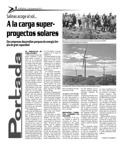un marco regulatorio claro y eficaz que promueve la inversión y el empleo. Nuestra empresa tiene comprometido invertir más de $200 millones en Puerto Rico”, expresó Mustad. Por su parte, Samy Esayag, Presidente de Yarotek dijo que “estamos seguros de que la asociación entre Sonnedix y Yarotek representará un gran aliado para Puerto Rico en su meta de aumentar la producción de energía limpia”. Global Energy Services (GES) será el contratista general de la planta solar, que generará alrededor de 120 empleos durante el periodo de construcción. Se estima que la producción de su primera fase de 10 MW AC proveerá energía a 2,500 residencias unifamiliares. Continúa en la página 5.
