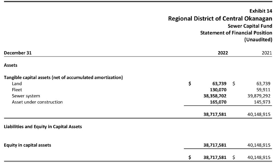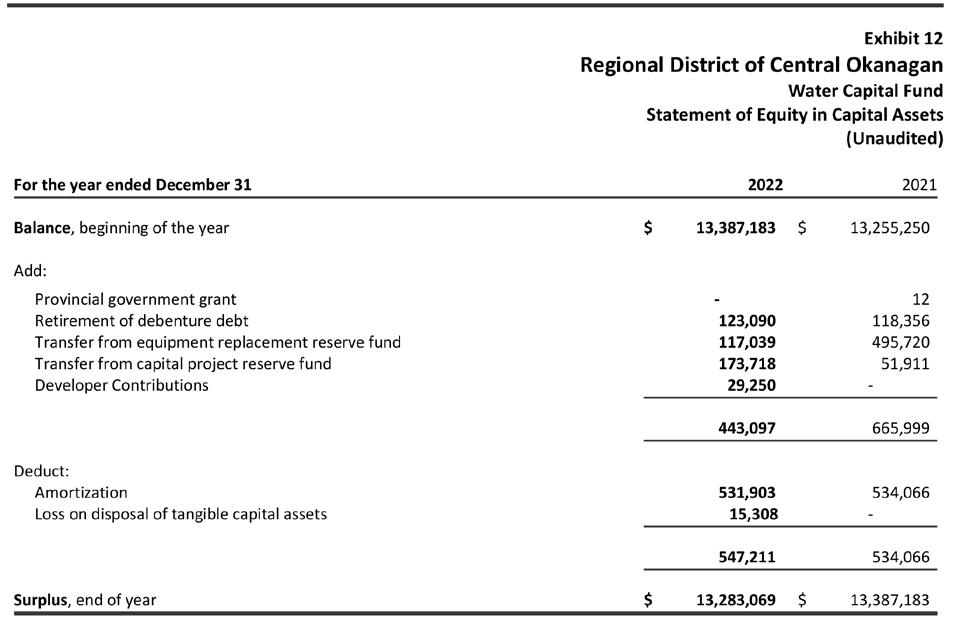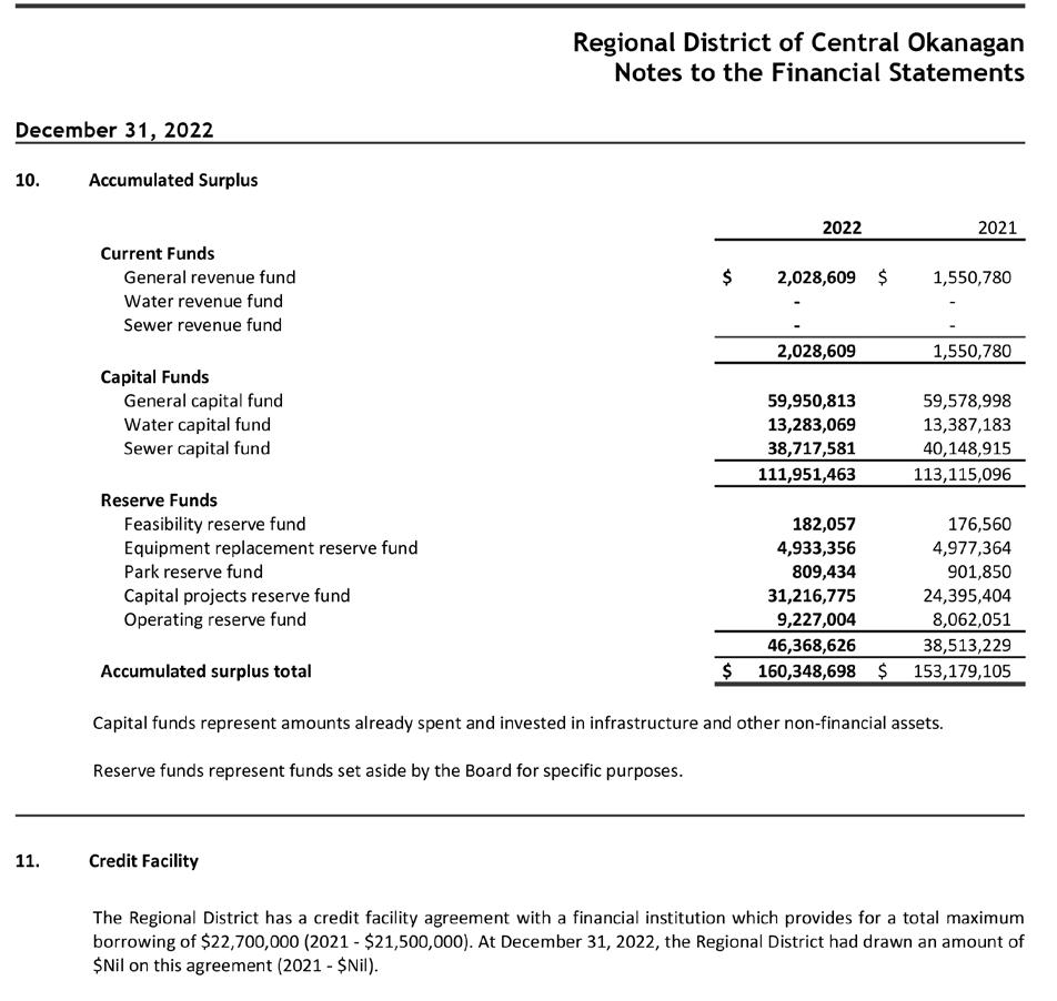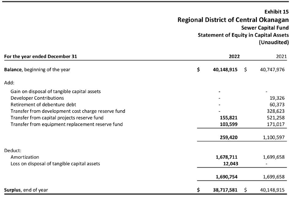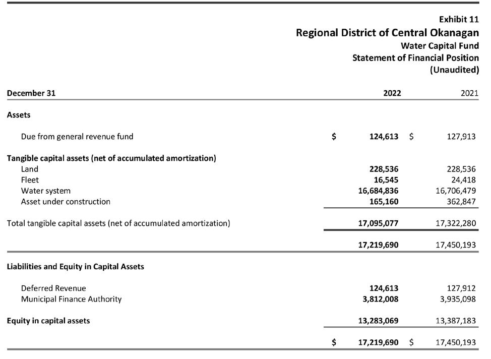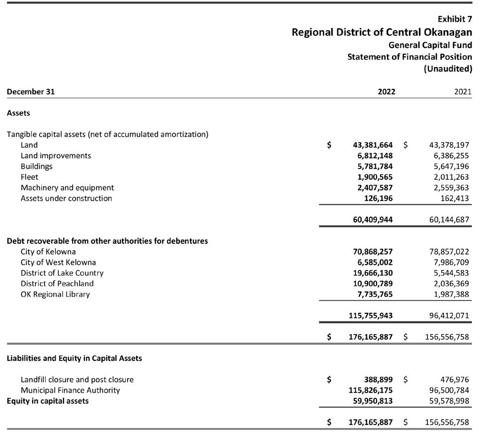 The RDCO is in a Net Asset position. This means that the district has sufficient financial assets ($190.7M) to settle existing liabilities ($147.0M). As the RDCO’s total assets exceed total liabilities, the RDCO is in an accumulated surplus position, having net positive resources that will be used to provide future services. The RDCO’s annual surplus was $7.2M (2022 $7.1M). The RDCO generated approximately $20.1M in cash from operations and those funds were used to acquire $3.0M in tangible capital assets, repay $7.8M in financing. The remaining was added to available cash resources.