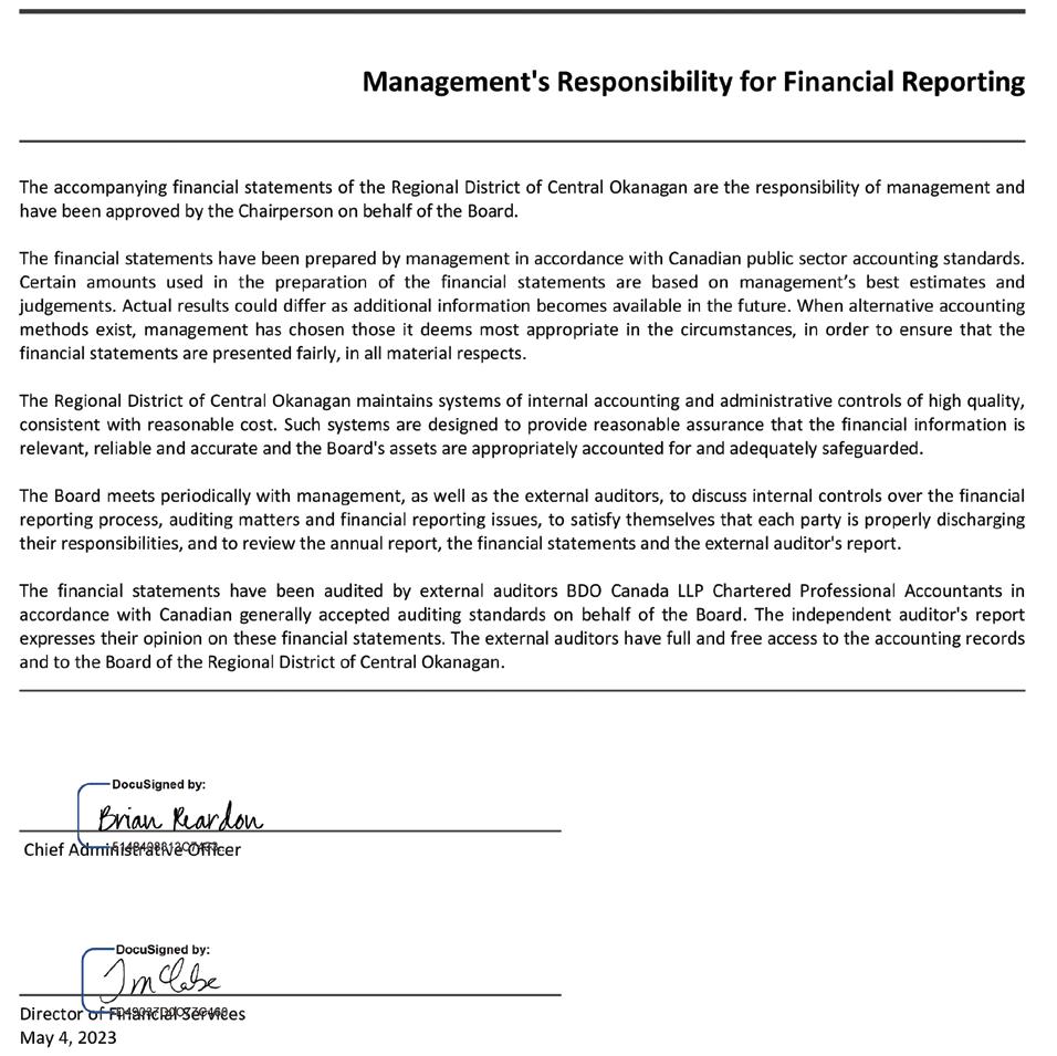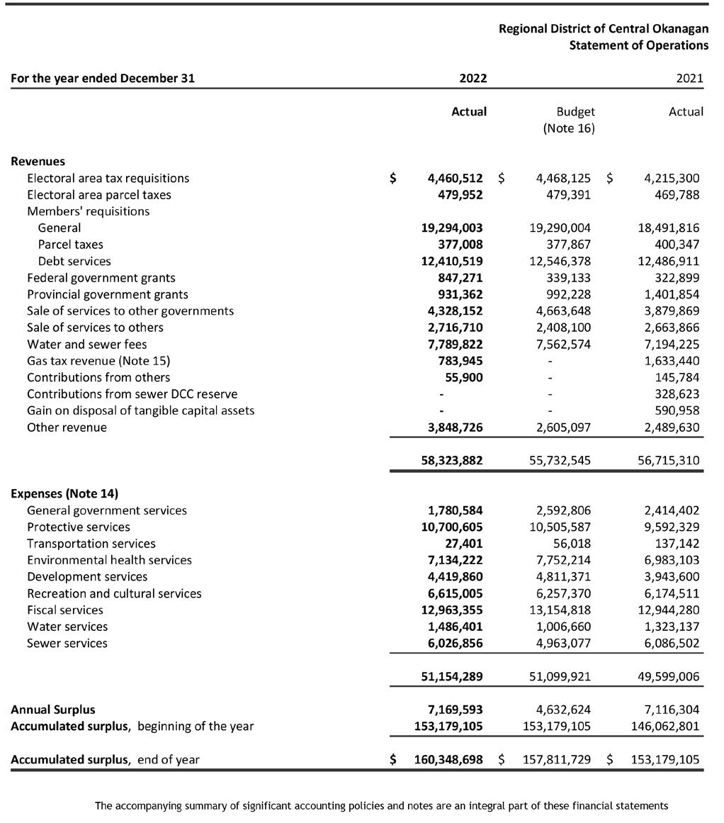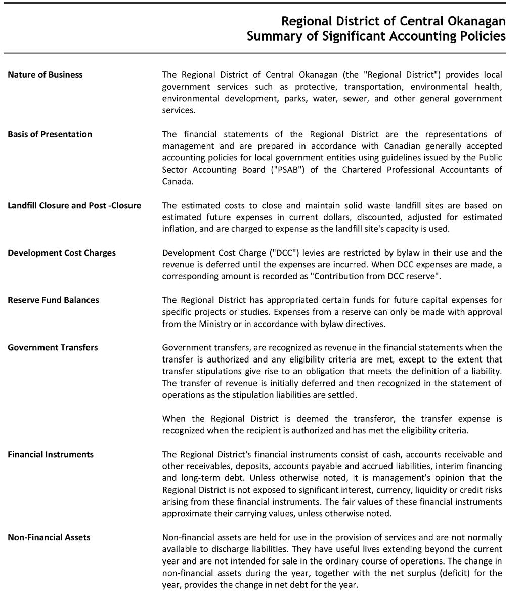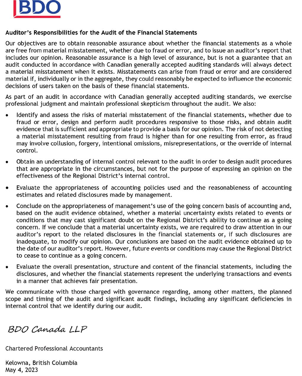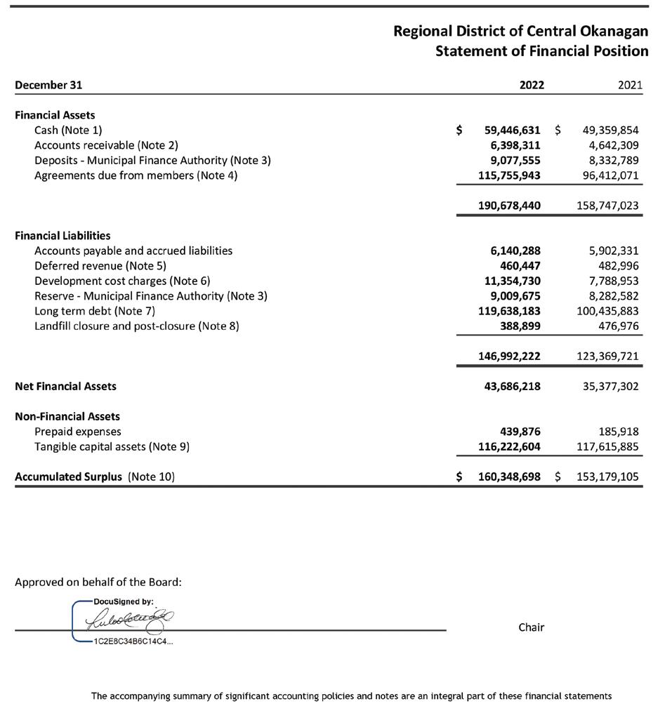 In accordance with Section 376 of the Local Government Act and Section 167 of the Community Charter, the Audited Financial Statements were presented and approved by the Regional Board on May 4, 2023. The format and presentation of these financial statements are in accordance with Generally Accepted Accounting Principles (GAAP) for local government as recommended by the Public Sector Accounting Board (PSAB) standards (PSAS) of the Chartered Professional Accountants of Canada and have been applied on a basis that is consistent with that of the preceding year.