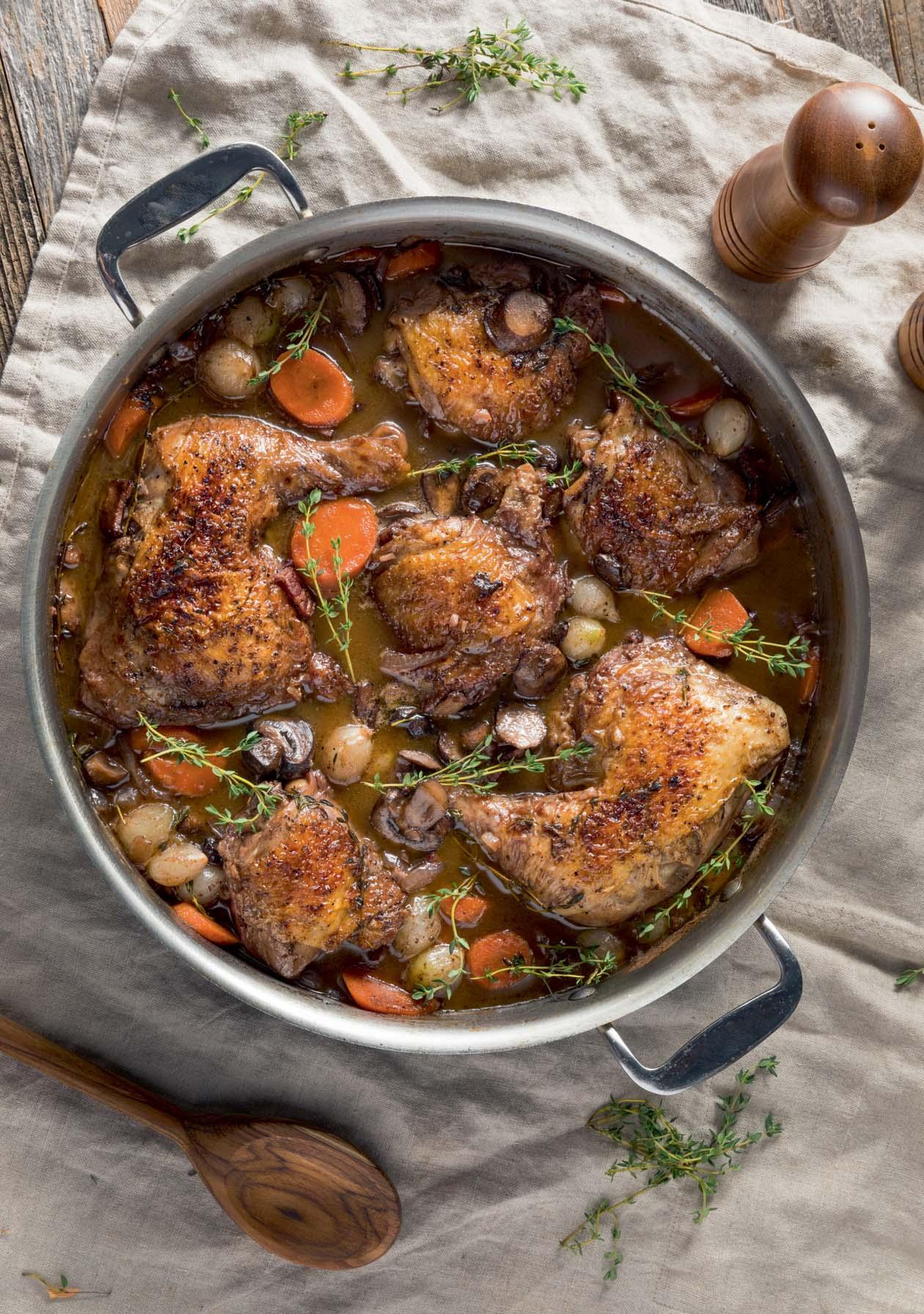 4.Addthecarrotsandmushrooms,turnuptheheatandaddtheredwine, chickenstockandvinegar.Addthechickenpiecesandanyjuicesfromthe plate.Bringthesaucetotheboilandthensimmergentlyforabout40minutes oruntilthechickenistenderandcookedthrough.