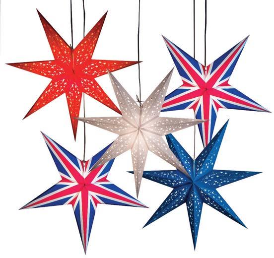 ThisRoyalcollectionof partylanternsincludes threestarsinred,white andblueandtwoLimited EditionUnionJackStars, boldlyfeaturingtheflagof theUnitedKingdom,£65. paperstarlights.com