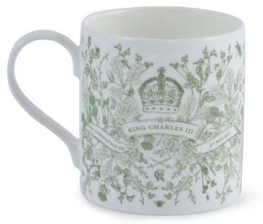 TheKingCharlesIIICoronationmugbearsthe nationalflowersfromtheUKalongwithoak,a symbolofstrengthandstability,andivy,the symbolofcommitment,whichtrails throughoutthisintricatelyhand-drawndesign, £21.50.www.victoriaeggs.com