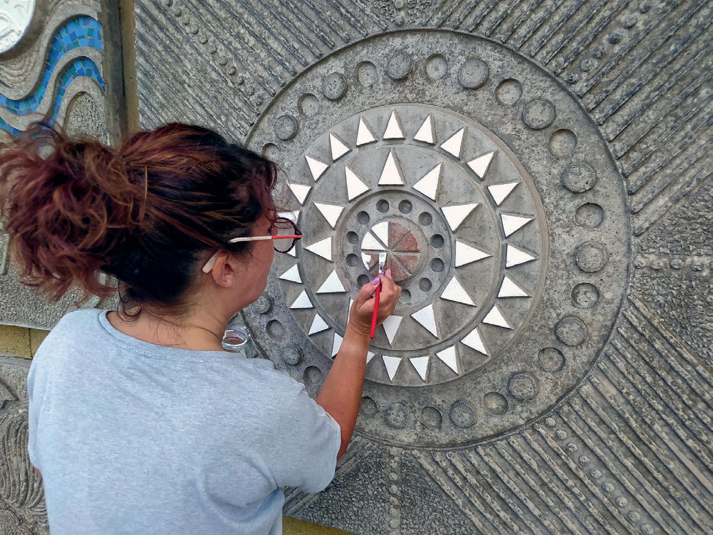 worked on the other murals from the same artist), it was advised to avoid the harsh use of chemical products and to use de-ionised water, washing-up liquid and brushes for the initial cleaning.