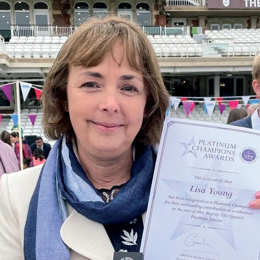 To mark the Queen’s Platinum Jubilee, the Royal Voluntary Service presented a number of awards to those who have made special contributions to the community, going the extra mile to improve the lives of others. One of the 490 Platinum Champion awards was given to Bexhill Foodbank Volunteer Lisa Young who accepted the award on Sunday 5th June at the Jubilee Lunch at the Kia Oval in London.
