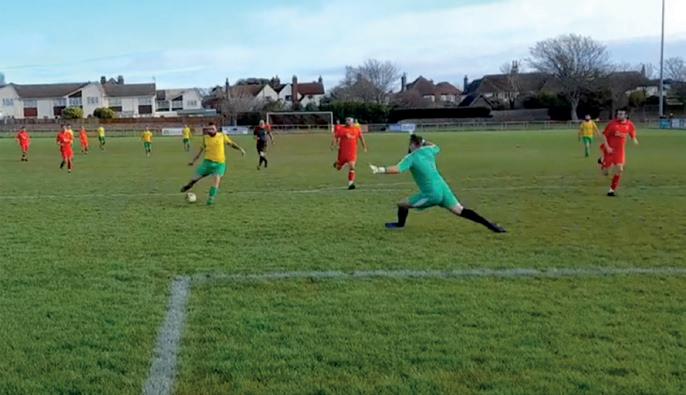 Connor Martin slots the ball past former Stringer Wester Young for Hailsham’s opener. Photo: Alan Hook
