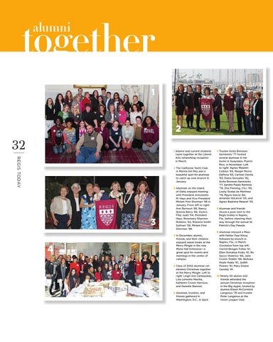7 Trustee Anita BrennanSarmiento ’77 hosted several alumnae in her home in Guaynabo, Puerto Rico, in November. Left to right: Agnes MalaretCollazo ’84, Margie Morris DaPena ’83, Carmen Davila ’83, Diana Gonzalez ’82, Anita Brennan-Sarmiento ’77, Sandra Pujals Ramirez ’78, Zita Fleming, CSJ, ’59, Leany Godas de Martinez ’78, Mayra Garcia ’84, Amanda Valcarcel ’05, and Agnes Badrena Malaret ’55. 8 Alumnae and friends struck a pose next to the Regis trolley in Naples, Fla., before cheering their way through the annual St. Patrick’s Day Parade. 9 Alumnae enjoyed a Mass with Father Paul Kilroy followed by brunch in Naples, Fla., in March. Clockwise from top left: Carroll Beegan Follas ’61, Ellen Donahue Foley ’61, Ro Sacco Vederico ’66, Jane Cronin Tedder ’66, Barbara Hoyle Healy ’61, Judith Powers ’61, Mary Doane Cassidy ’61. 10 Nearly 50 alumni and friends attended the annual Christmas reception in the Big Apple, hosted by alumna Eileen McCormick Langenus ’78 and trustee Peter Langenus at the Union League Club.
