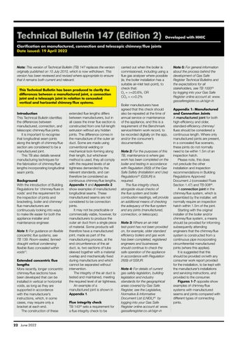 Note: This version of Technical Bulletin (TB) 147 replaces the version originally published on 15 July 2010, which is now withdrawn. This version has been reviewed and revised where appropriate to ensure that it remains both current and relevant. This Technical Bulletin has been produced to clarify the differences between a manufactured joint, a connection joint and a telescopic joint in relation to concealed vertical and horizontal chimney/flue systems. Introduction This Technical Bulletin identifies the differences between manufactured, connection, and telescopic chimney/flue joints. It is important to recognise that longitudinal seam joints along the length of chimney/flue section are considered to be a manufactured joint. This TB also details several manufacturing techniques for the fabrication of chimney/flue lengths incorporating longitudinal seam joints. Background With the introduction of Building Regulations for ‘chimney/flues in voids’ and the requirement for the inspection of joints and bracketing, boiler and chimney/ flue manufacturers are continuously looking into ways to make life easier for both the appliance installer and maintenance engineer. Note 1: For guidance on flexible concentric flue systems, see TB 139: Room-sealed, fanneddraught vertical condensing flexible flues concealed within voids(1). Extended concentric flue lengths More recently, longer concentric chimney/flue sections have been developed that can be installed in vertical or horizontal voids, as long as they are supported in accordance with the manufacturer’s instructions, which, in some cases, may require only a bracket at each end. The construction of these