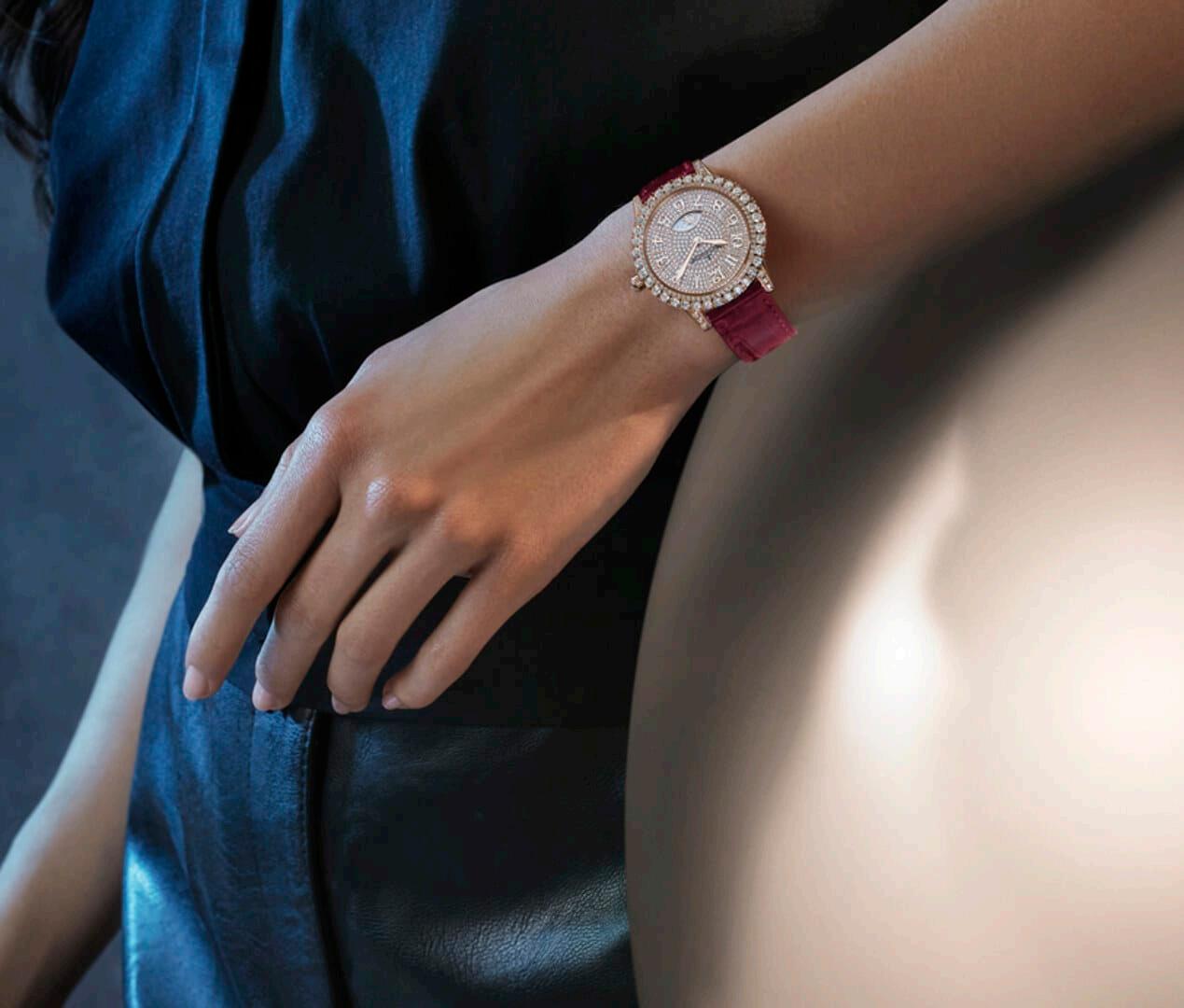 The new timepieces are presented with the option of a shiny alligator strap in vivid red that contrasts with the stones’ sparkle, or a High Jewellery pink gold bracelet. Initially designed for the Rendez-Vous Dazzling Shooting Star in 2022, the bracelet consists of lozengeshaped links, joined seamlessly together like a supple ribbon to wrap around the wrist. Representing an additional 80 hours of gem-setting, the links are grain-set with 436 diamonds;