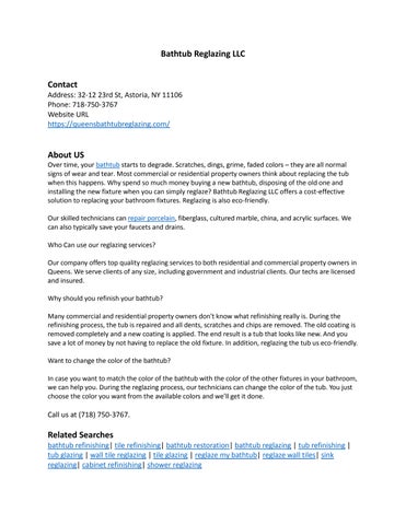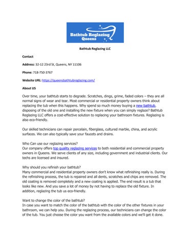 Phone: 718-750-3767 About US Over time, your bathtub starts to degrade. Scratches, dings, grime, faded colors – they are all normal signs of wear and tear. Most commercial or residential property owners think about replacing the tub when this happens. Why spend so much money buying a new bathtub, disposing of the old one and installing the new fixture when you can simply reglaze? Bathtub Reglazing LLC offers a cost-effective solution to replacing your bathroom fixtures. Reglazing is also eco-friendly. Our skilled technicians can repair porcelain, fiberglass, cultured marble, china, and acrylic surfaces. We can also typically save your faucets and drains. Who Can use our reglazing services? Our company offers top quality reglazing services to both residential and commercial property owners in Queens. We serve clients of any size, including government and industrial clients. Our techs are licensed and insured. Related Searches bathtub refinishing| tile refinishing| bathtub restoration| bathtub reglazing | tub refinishing | tub glazing | wall tile reglazing | tile glazing | reglaze my bathtub| reglaze wall tiles| sink reglazing| cabinet refinishing| shower reglazing Additional Details Working Hours: Monday-Sunday-8 am–8 pm GMB Listing https://www.google.com/maps?cid=2968847590586121954