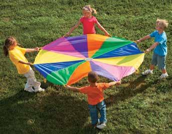 Hang this parachute from a ceiling for decorating or take it outdoors for games. Polyester with nylon handles. Machine washable. 12'.