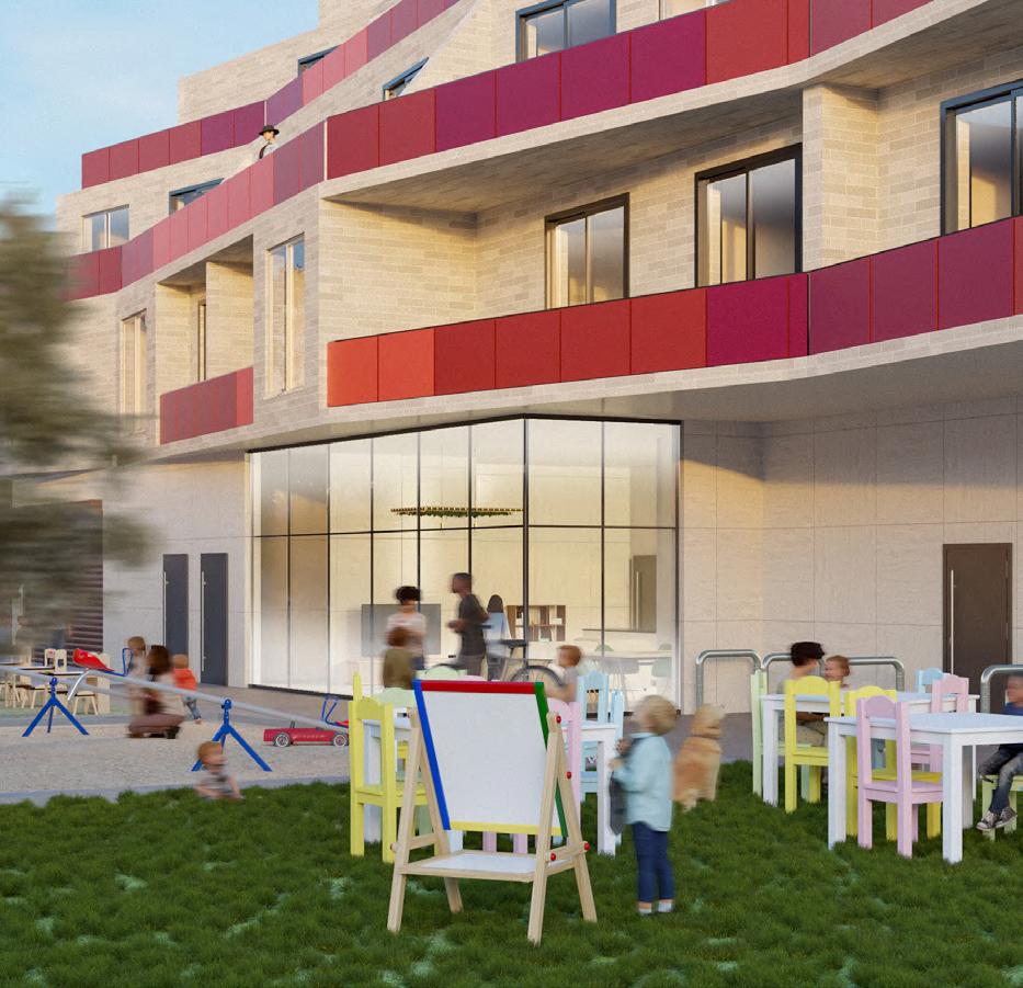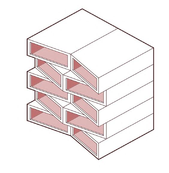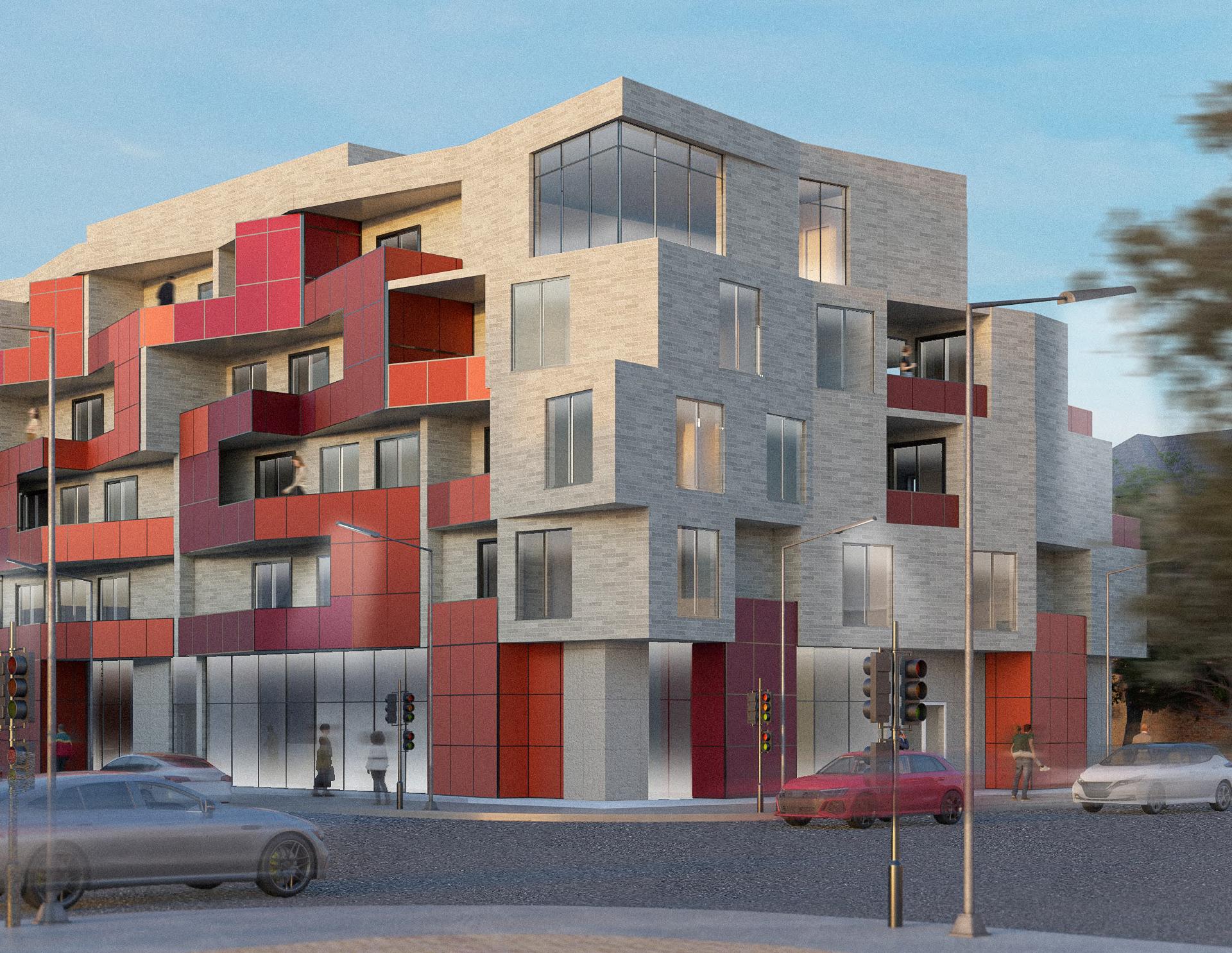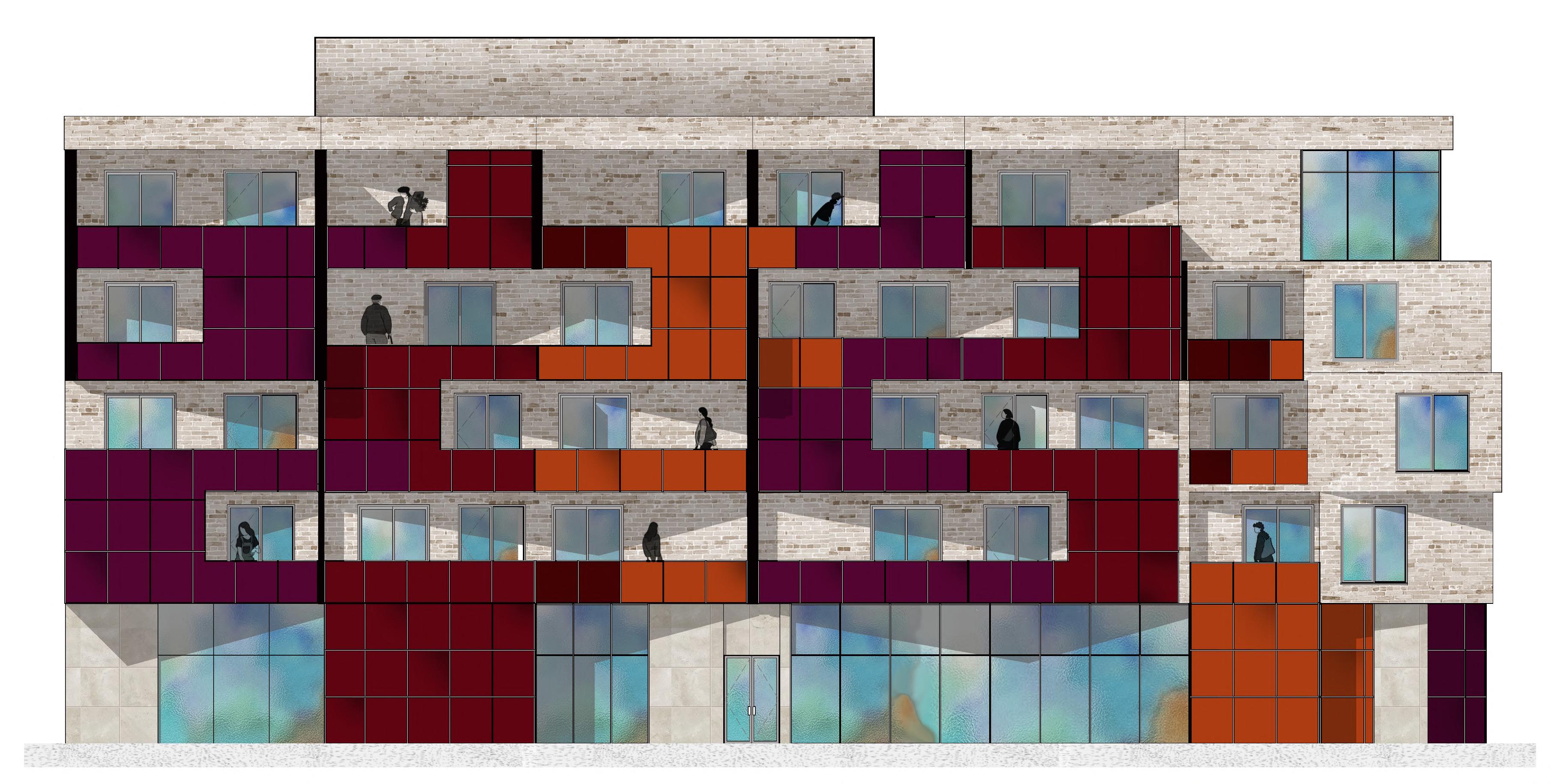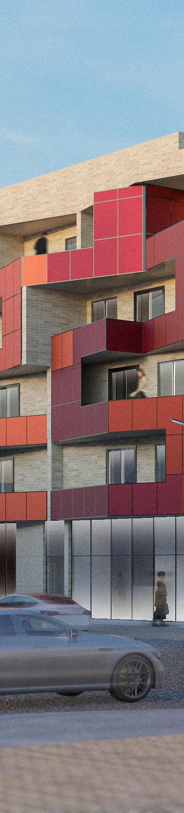 The building’s architecture is distinctive, integrating its red aluminum panel facade with railings for the units, and the change in the angular plane in its facade to allow for better lighting and views. The red complements the surrounding predominantly red-brick housing, symbolizing an ideal for affordable housing with spacious units and simplistic internal circulation in its floor plans.