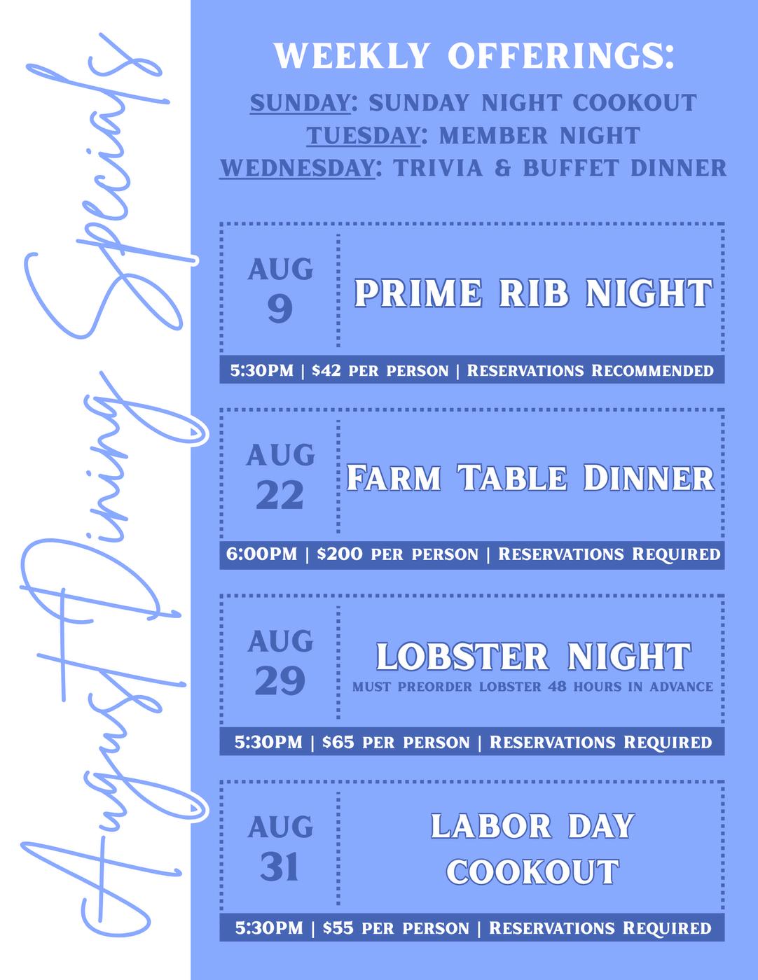 On Saturday, August 2, the Club will offer lunch service only on the Bayside Grill patio until 3pm. This will give the Talon Tribe time to set up for a memorable evening for the Centennial Gala. The pool will close at 5pm. The boat dock will be unavailable on Saturday, August 2.