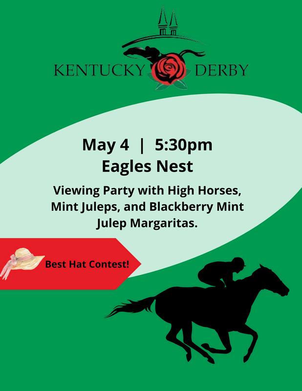 As the month of May begins, the F&B offerings for the golf leagues do too. On Thursday, May 2 the Men’s Day buffet and Ladies’ Day Kickoff Cocktail Party will be held. Moving into that weekend, the Kentucky Derby viewing party in the Eagles Nest is sure to be fun with Members dressed for the occasion and hopefully staying to enjoy a great meal. Cinco de Mayo falls on Sunday this year so a special menu that evening along with a margarita station and a regular menu will be offered that day.