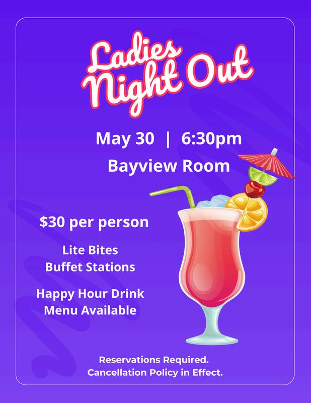 In May, we will continue “Happy Hour” Tuesday through Saturday everywhere in the Clubhouse as well as the Bayside Grill Patio from 5pm – 6pm and the “Bar Bites” menu will be available at that time. We will also be continuing Bingo on Wednesdays in May but with a twist. Bingo will be in the Ballroom with a change in the menu concept from a burger buffet to a pasta buffet. On the Wednesday night pasta buffet, Chef Carolyn will offer three types of pasta dishes along with salads and dessert. This will enable the Food and Beverage Tribe to transition smoothly into June when Trivia begins.