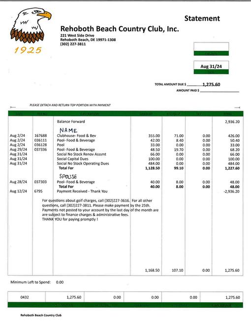Since joining RBCC, I have been working diligently to help simplify the readability of Member statements and process to make payments. The statements now are broken down by spending per person on the membership account. The bottom of the statement and the top, now reflects the total amount due on the account. In the bottom left corner, there is a minimum left to spend where a Member can track their food and beverage spending for the fiscal year (April 1 to March 31).