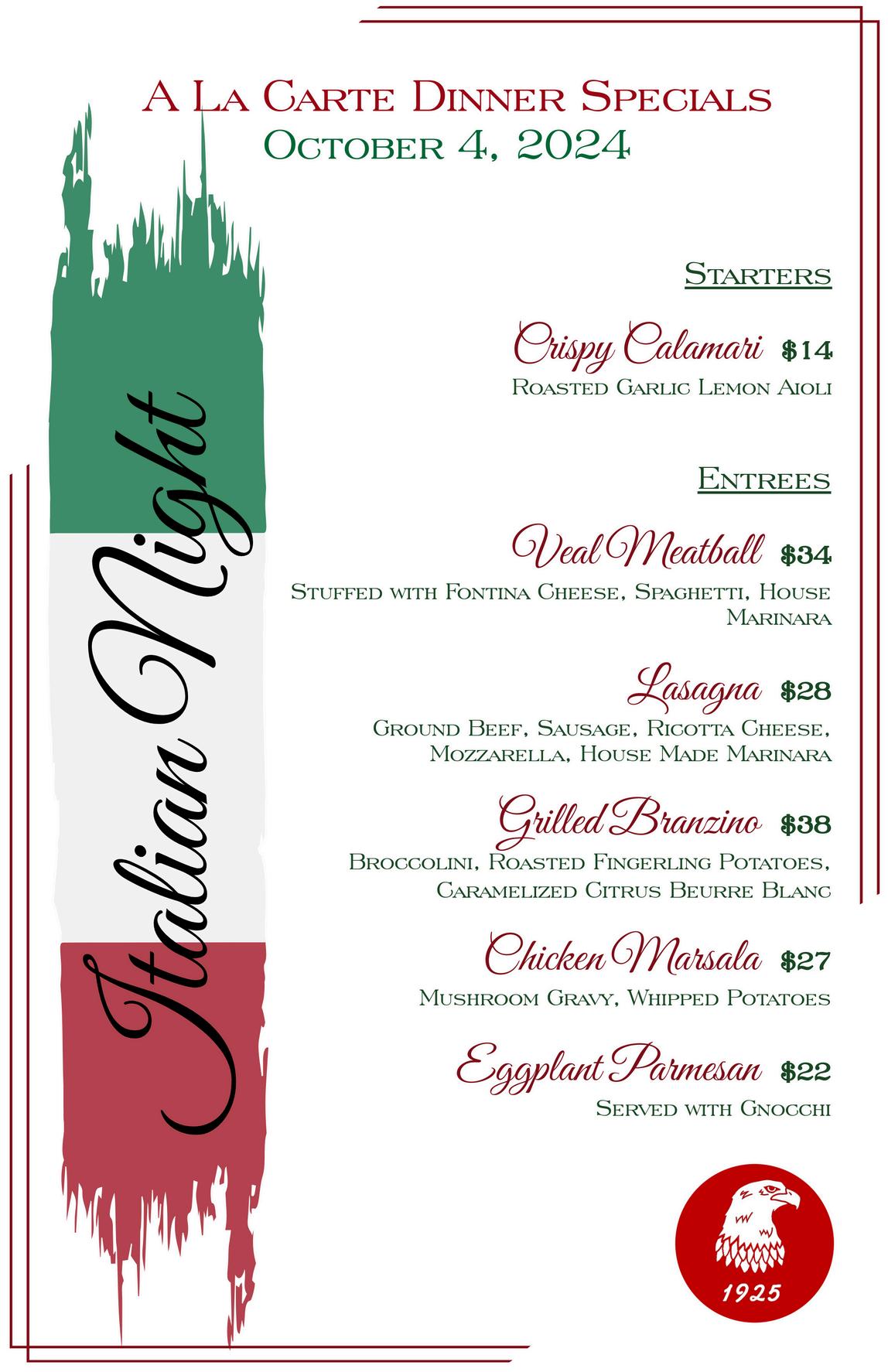 “Italian Night” will be on Friday, October 4 and Chef Carolyn will offer specials that evening along with the a la carte menu. “Crab Cake Night” will be on Thursday the 10th and feature discounted crab cake platters as well as other crabmeat dishes special for that evening. The very popular “Prime Rib Night” will be on Saturday, October 26 and as always will also include other features as well as the full menu.