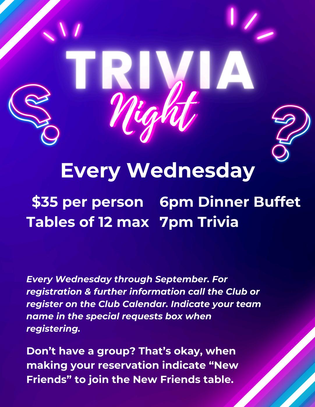 The season is far from over as September is full of new events and we will continue the weekly favorites. Member Nights will continue Tuesdays with Chef Carolyn’s great dishes and the $25.19 three course menus. Trivia nights have been spectacular as Chef Carolyn has featured themed buffets from around the world. Many Members have said that the food was authentic and delicious. Trivia will run through Wednesdays in September with the last Trivia Night on Wednesday, September 25.